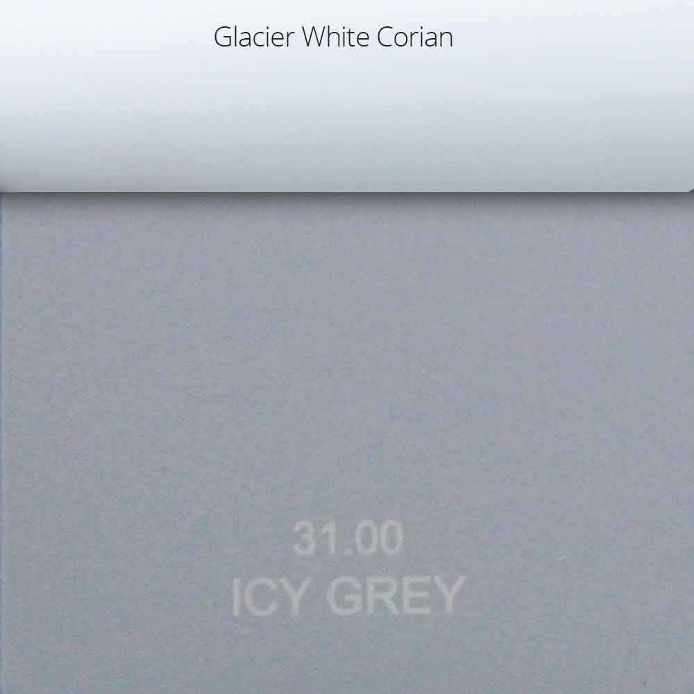 - Icy Grey + Glacier White Corian®: matt kall, ljusgrå yta med vita DuPont ™ Corian®-element;
