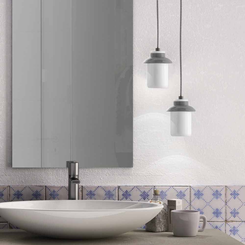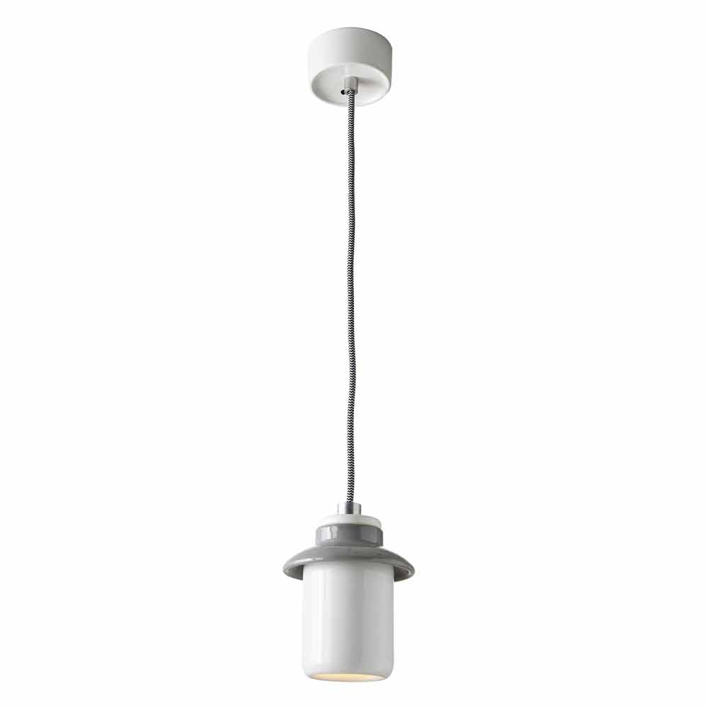 Asien är en fantastisk fjädringslampa av vit och grå keramik, med svartvitt tygkabel och aluminiumskabelklämma.