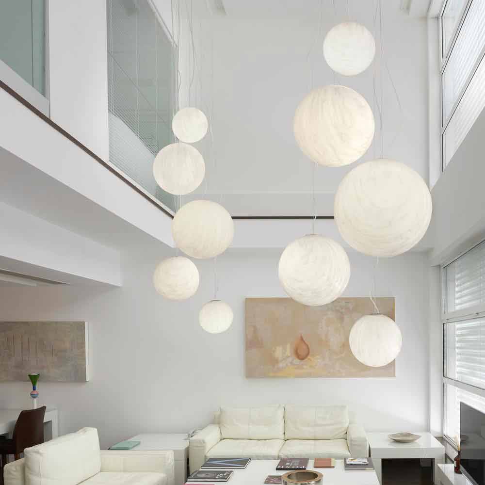 Den kan användas både som en enda ljuskrona och som en sammansättning av sfärer av olika storlekar för att omvandla den till en stor modulär självlysande stödpunkt med en rosett för fem Minerallampor, som kan säljas separat.