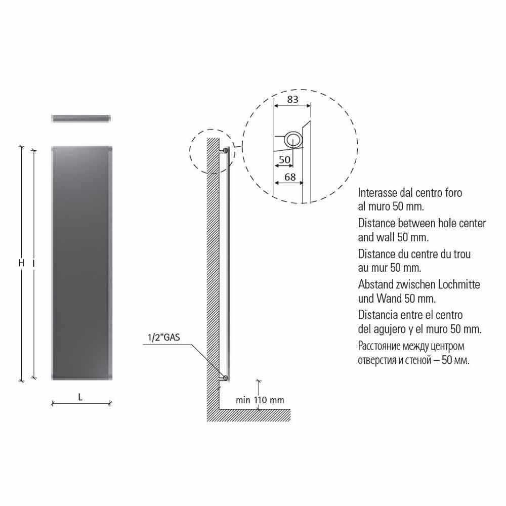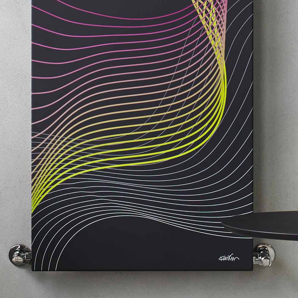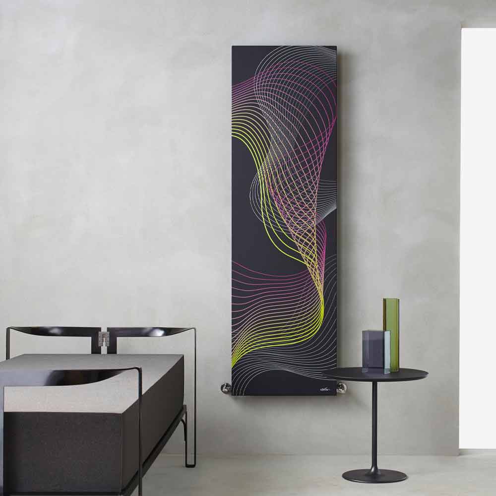 Designradiator i vertikal stålvägginstallation, tillverkad i Italien.