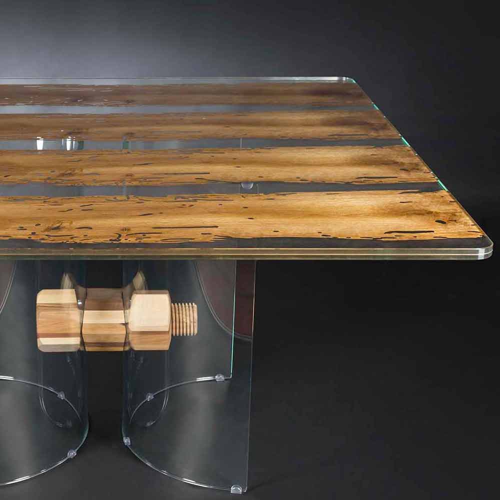enkel och elegant, fyrkantig och unik design och oefterhärmlig lämpar sig för alla typer av möbler bord. I det trä av "Briccole" och glassmältan i en varm och oupplösliga omfamning. En unik egenskap hos denna tabell ligger i dess bas gjord av böjda glas sammanfogade medelst en skruv och en mutter design, tillverkad med olika träslag i en fin bearbetning av hantverkare skåp.