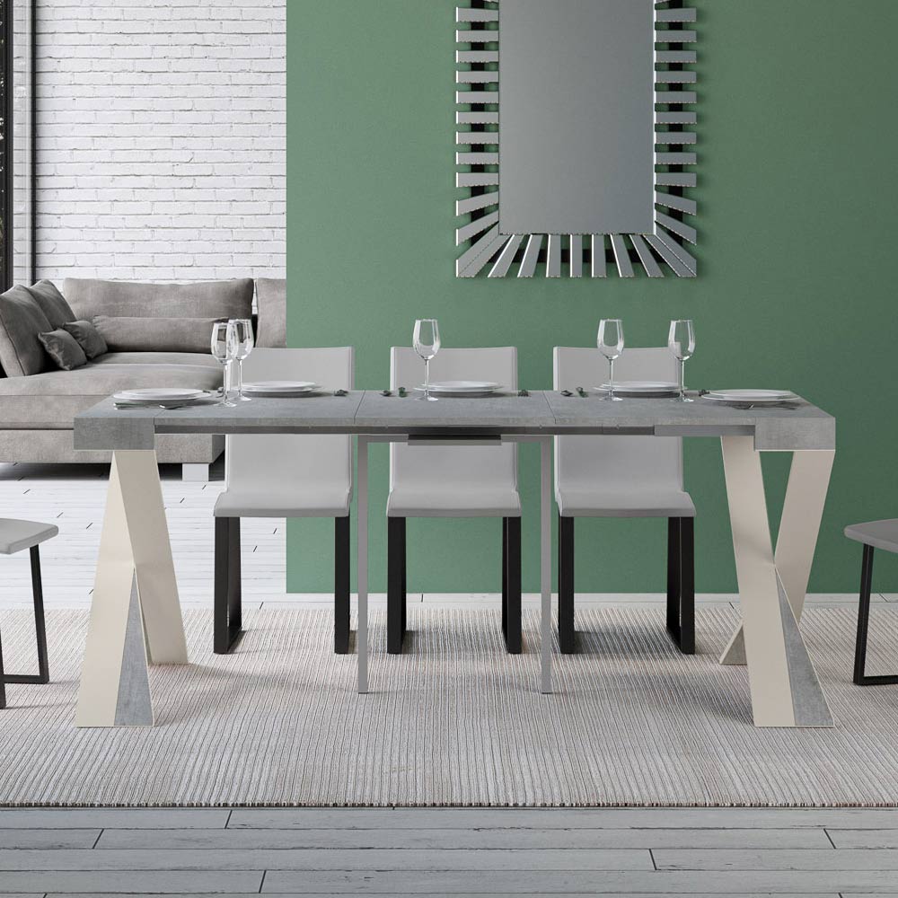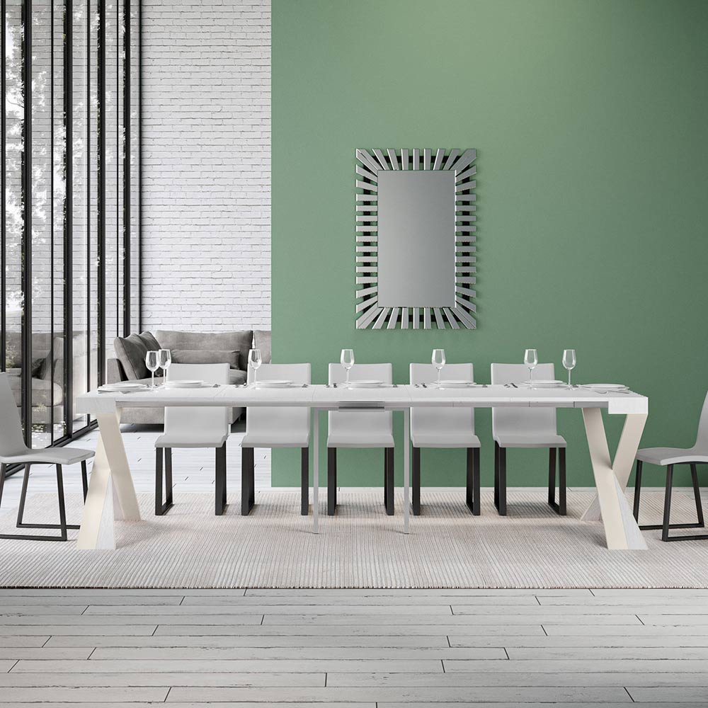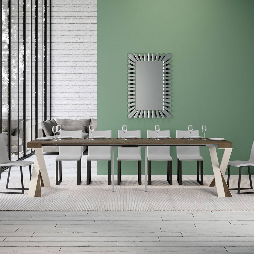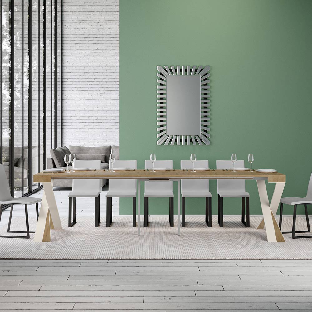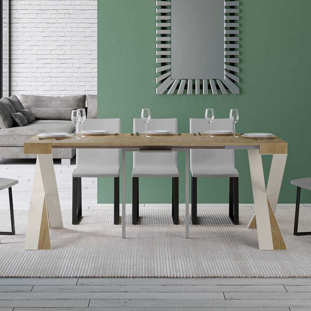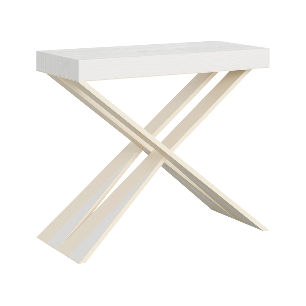 Detta utdragbara konsolbord förkroppsligar elegans och funktionalitet i en iögonfallande design. É har en modern silhuett med en X-bas som inte bara ger ett solidt stöd utan också ger en touch av sofistikerad originalitet. Toppskivan i mönstrat träè en hyllning till kvaliteten hos Made in Italy, uppskattad för sin hållbarhet och förmåga att stå emot tidens gång.