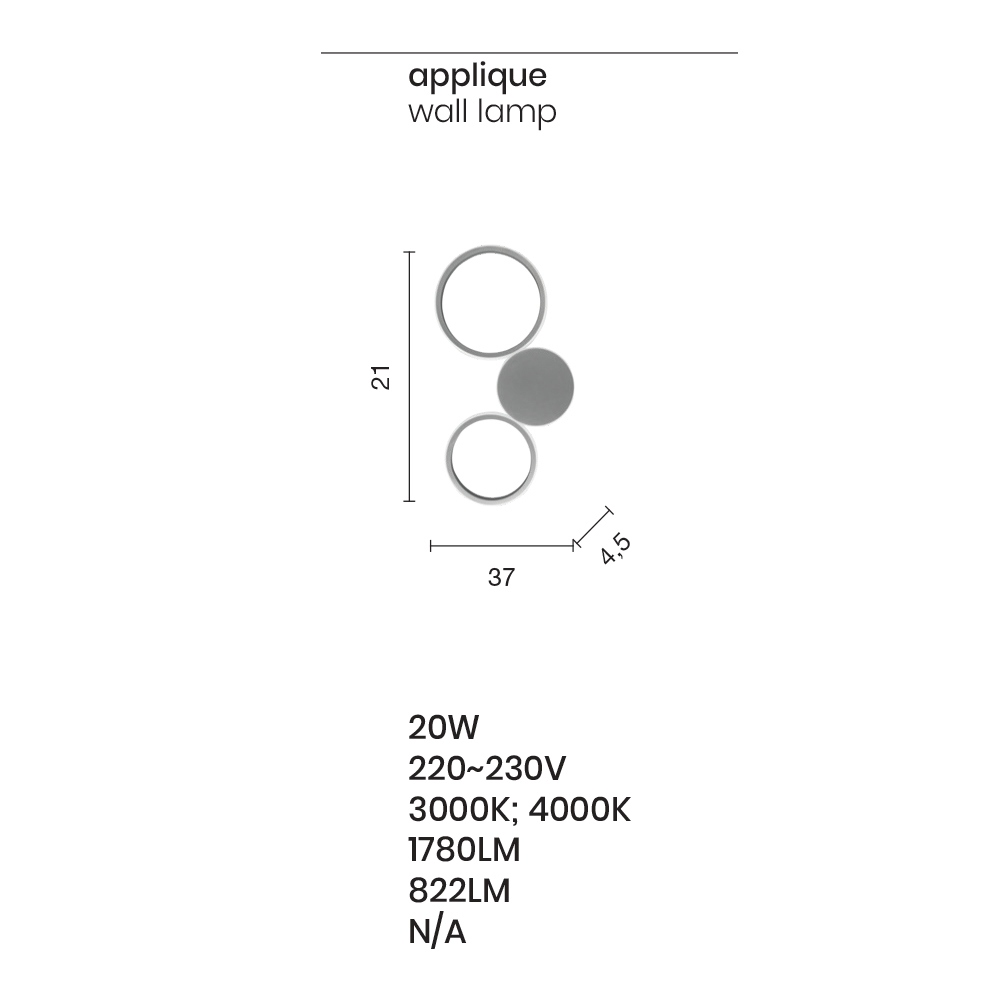 LED-källa. Elegans och originalitet förenas i en modern komposition som består av tre cirklar i olika storlekar sammanfogade och täckta på utsidan av en mjölkvit diffusor som omsluter LED-remsan, vilket skapar underbara ljuseffekter på väggarna för ett resultat med en