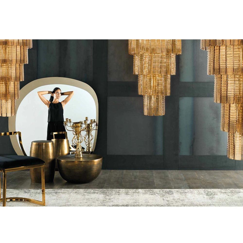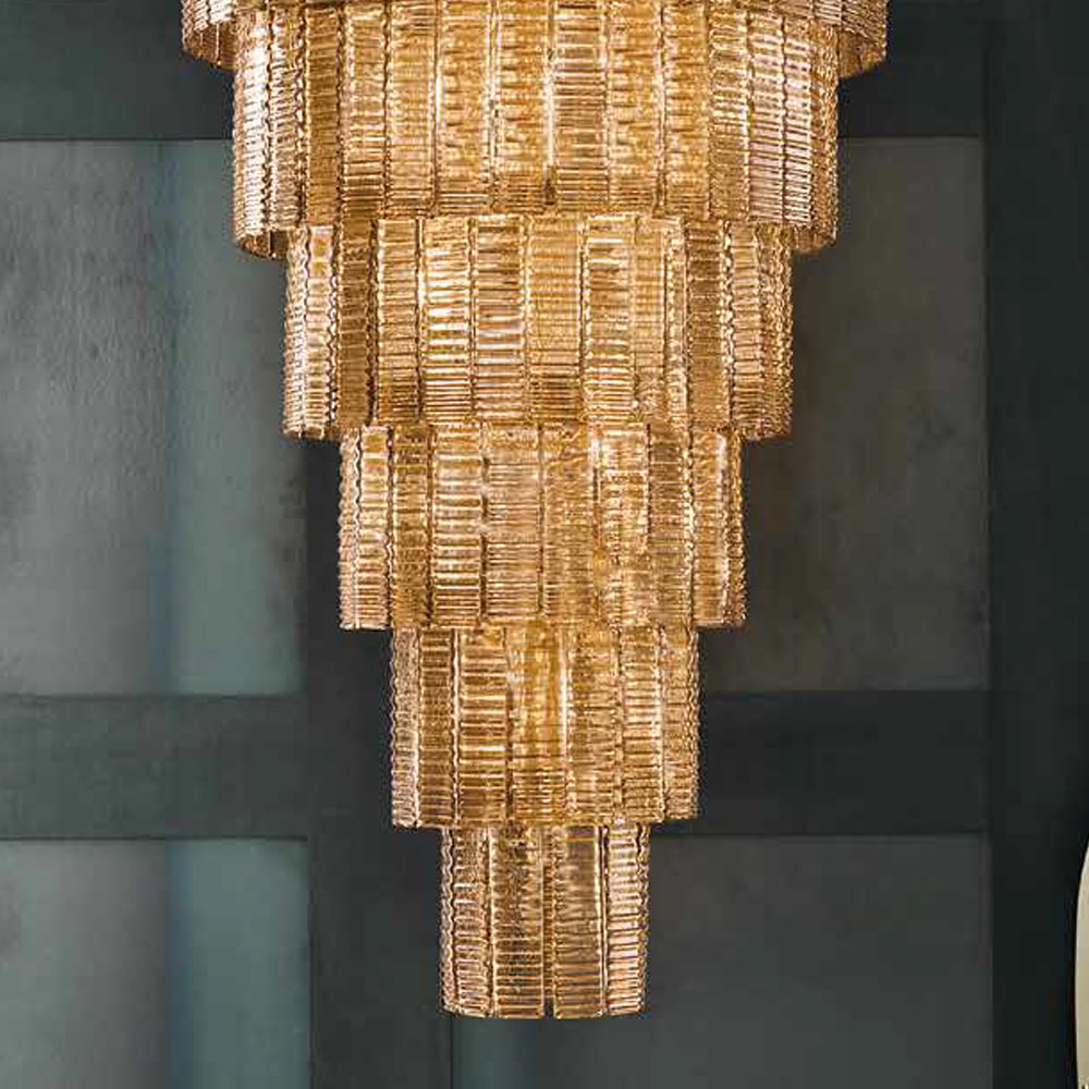Den 36-ljus ljuskronan med en majestätisk och raffinerad design är en lyxig belysningstillbehör helt handgjord i Italien av högkvalitativa hantverksglasmoduler med geometrisk dekoration . Metallstrukturen finns i satängguld och satinpolerad finish. Den extremt eleganta produkten presenterar en obestridd stil, vars gränslösa charm blir huvudpersonen i destinationsutrymmet. Idealisk för att karakterisera stora utrymmen med smak och prakt, för värdefulla och förtrollande atmosfärer.