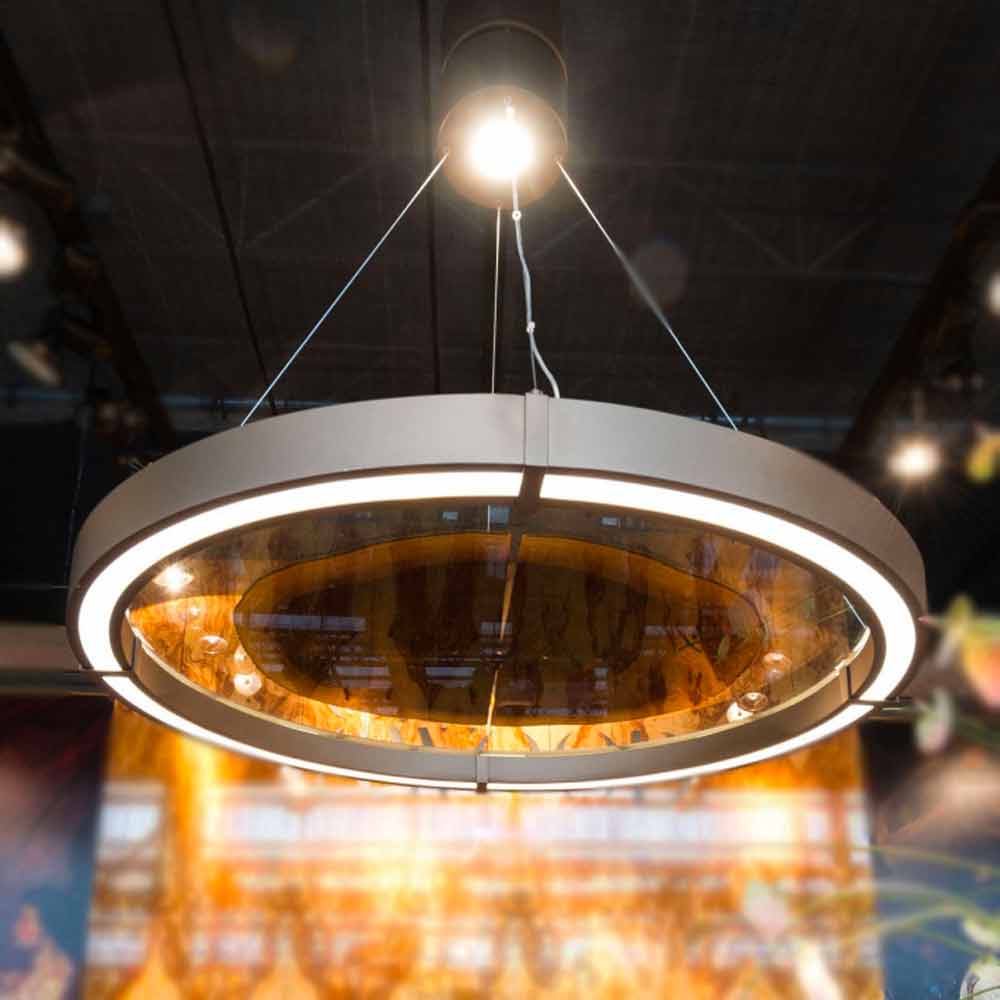 Modern ljuskrona med stålkonstruktion i bronsfinish med en cirkulär form inuti vilken vi hittar en kopplad glasplatta med en insats i canalettot valnöt . Tillverkat i Italien genom användning av kvalitetsråvaror , detta komplement erbjuder en original och fängslande idé om belysning som förkroppsligar elegans och samtida. Dess särdrag representeras av den underbara kombinationen av utvalda färger och finish som ger liv till ett verkligt konstverk som kan revolutionera alla delar av huset tack vare mötet mellan metallens modernitet, glasets tidlösa elegans och underbara färger i trä och dess korn. Formen och dimensionerna som understryker dess estetik gör det till en perfekt lösning för att belysa stora utrymmen som matsalar eller vardagsrum där de kompletterar möblerna med en raffinerad och innovativ touch, samtidigt som de skapar en fantastisk varm och välkomnande atmosfär .