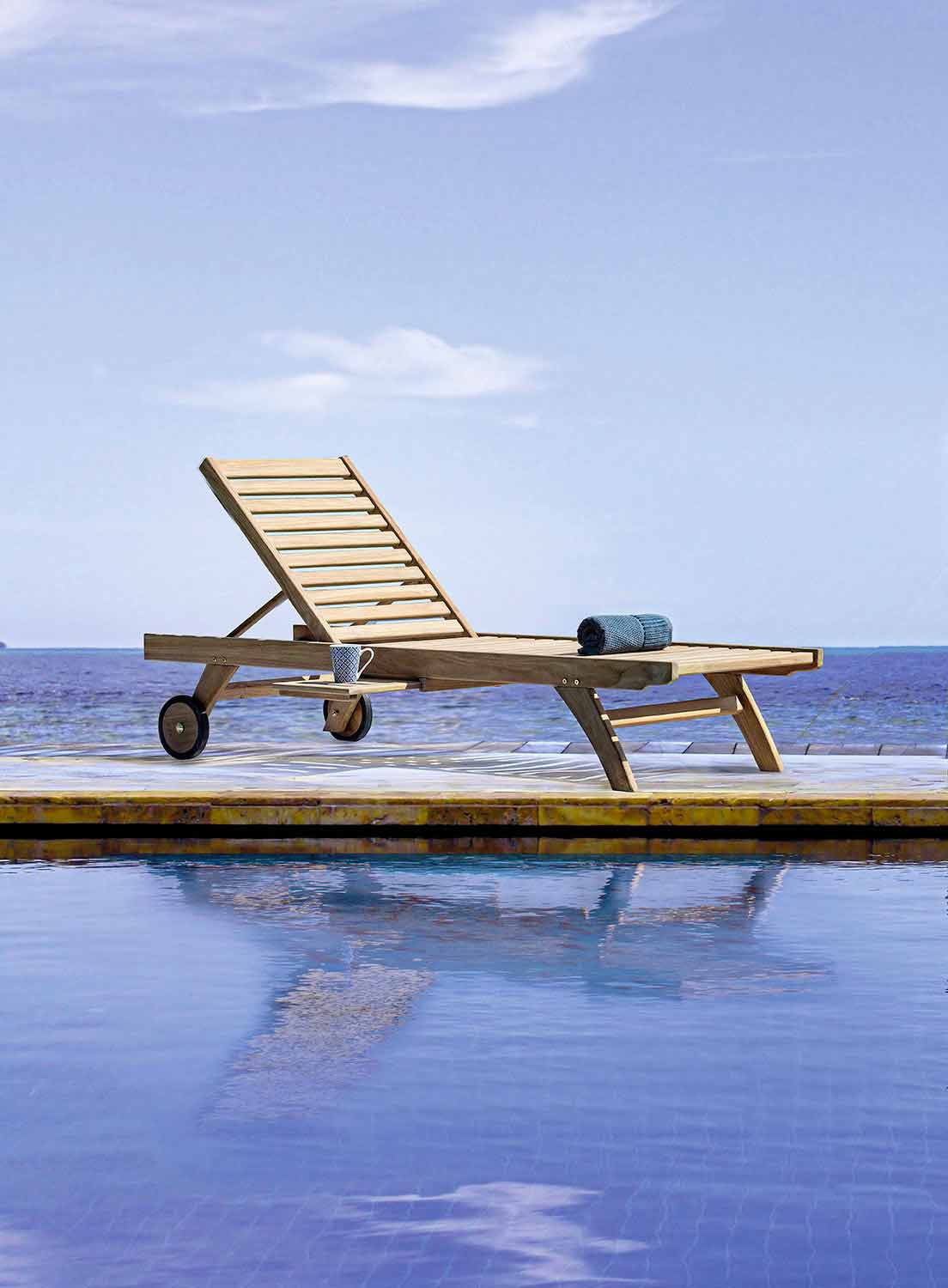 Utomhusdesign solstol med hjul, liggande och förvaringsfack i teak trä.