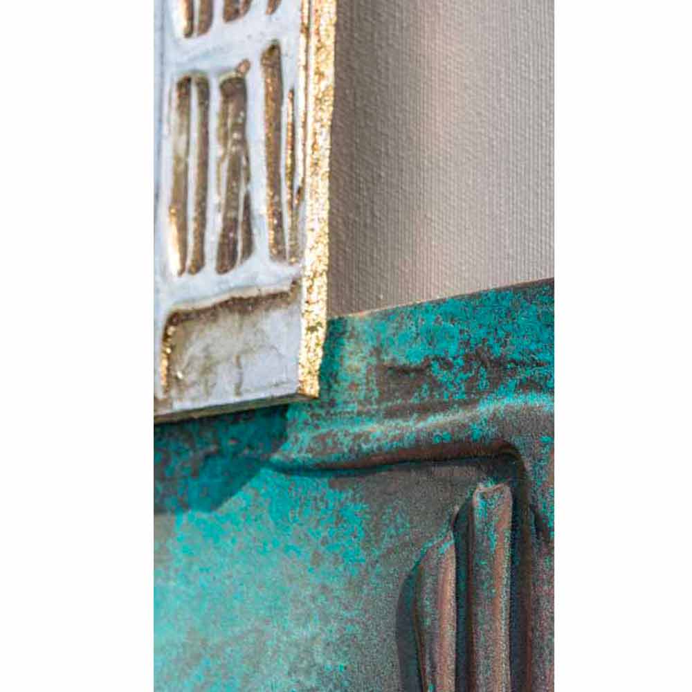 - Taupe lackerad tygstruktur med åtta materialelement, guld, silver, rostätad bronsfinish, överlappande och handdekorerade finish.