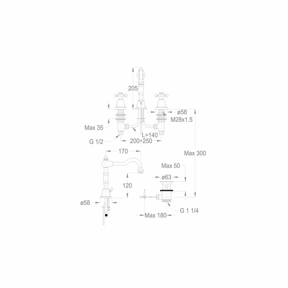 Klassisk design med tre håls tvättställsblandare i krom mässing 205 mm hög och med ett avstånd på 170 mm med avlopp och pop-up-avfall.