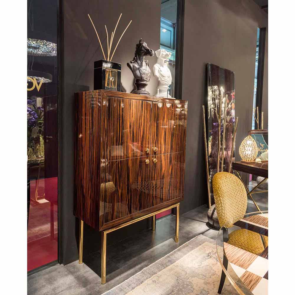 Interiören är mattlack med spegel tillbaka och strukturell hylla (plus två glashyllor medföljer), med Salice gångjärn hämmande stängning skinande finish och knoppar eller handtag i smältande guld finish. Oädel metall 24 karats polerat guld finish.