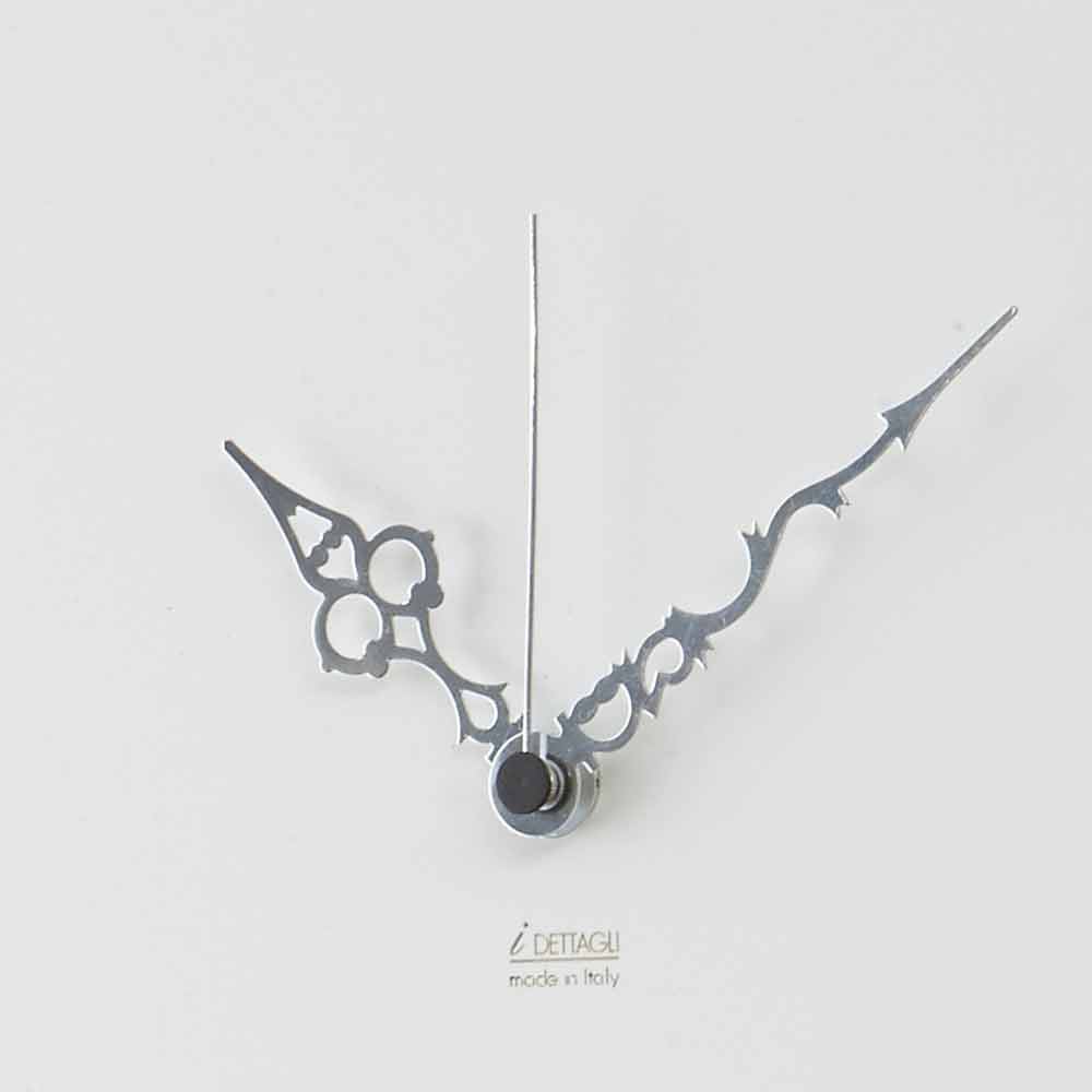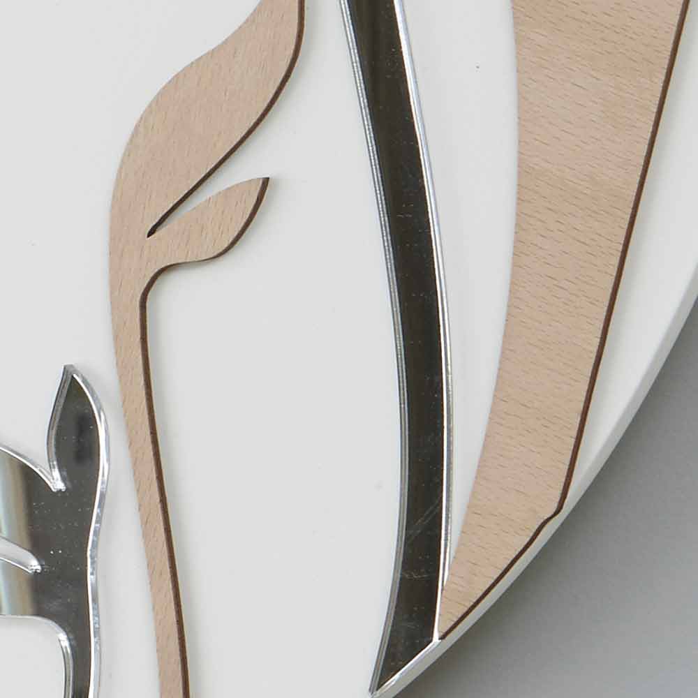 Väggklocka med en rund design i vitt trä med dekorationer i trä och plexiglas, modernt och gjort i Italien.