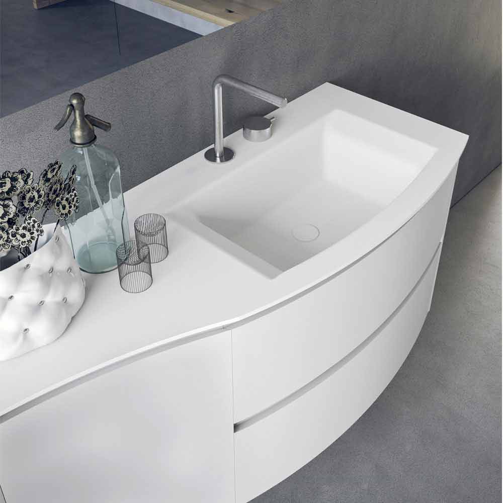 Minimal badrumskomposition, upphängd och böjd design med integrerad handfat, tillverkad i Italien.