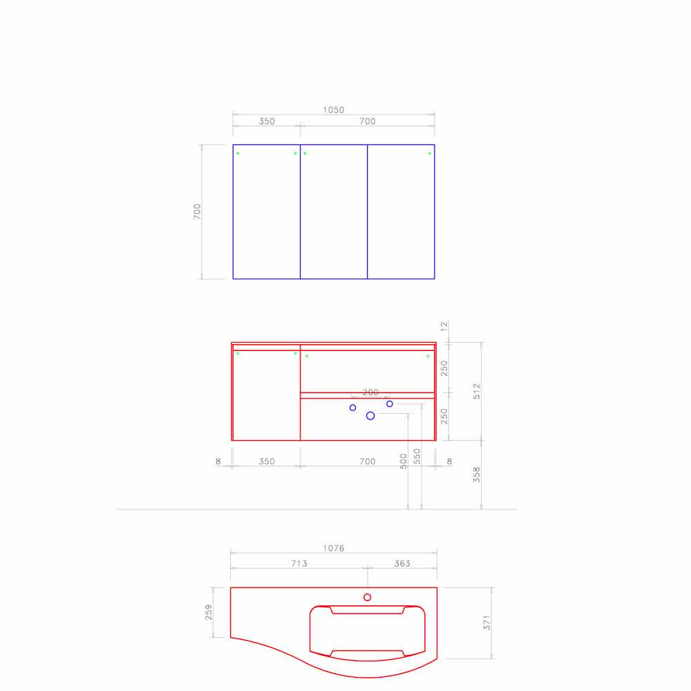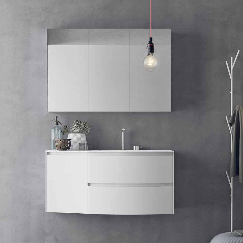 Badrumsmöbler med polerade vita lackerade böjda fronter, handfat integrerat i Novcryl vitblank , spegelskåp med 3 dörrar i blankvit.