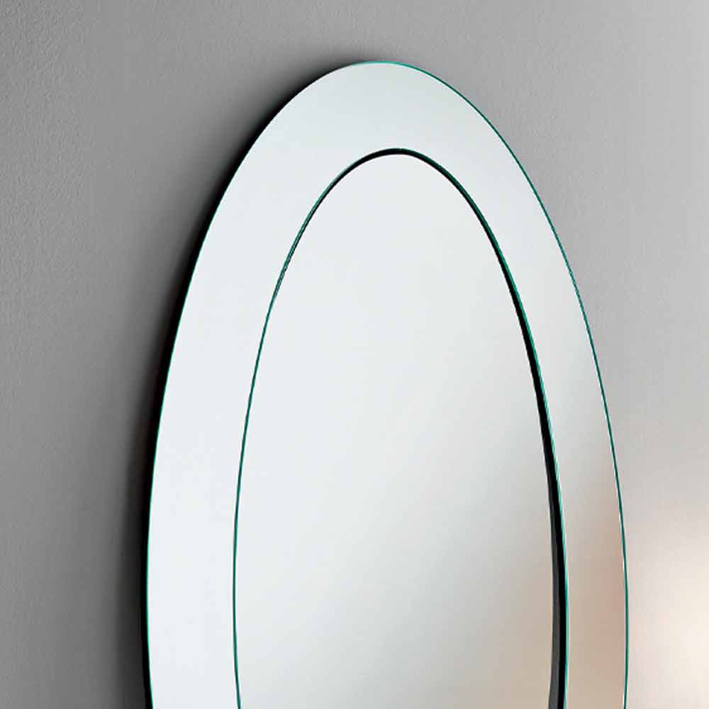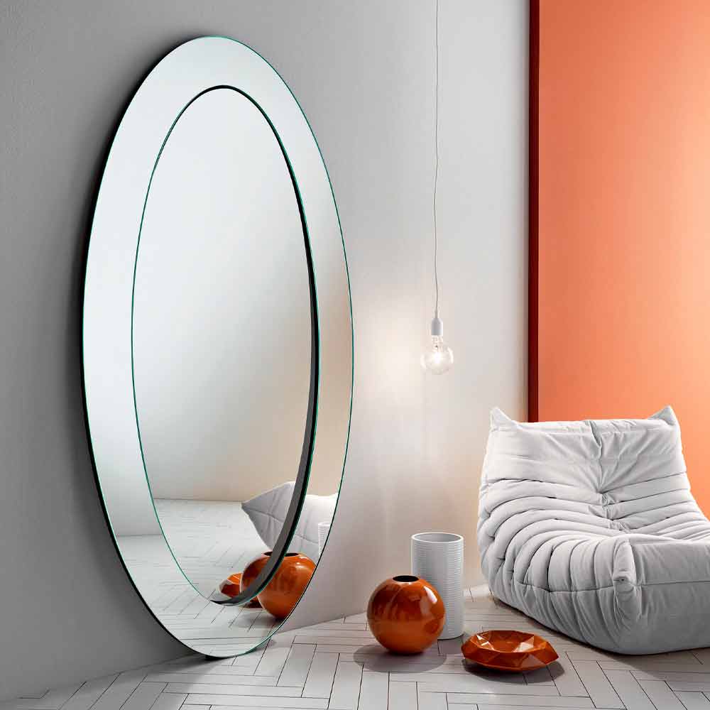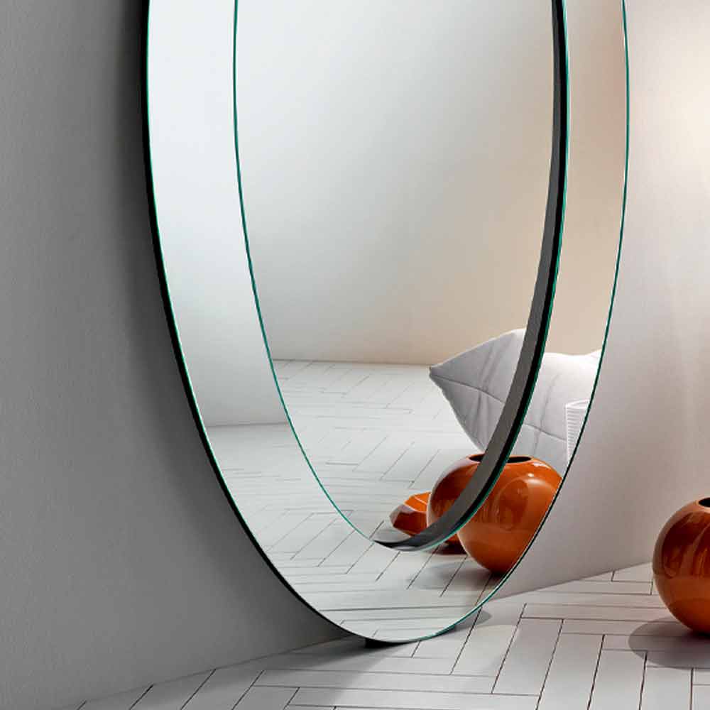 Oval fristående spegel i modern stil med lutande ram, realiserad i Italien för hand.