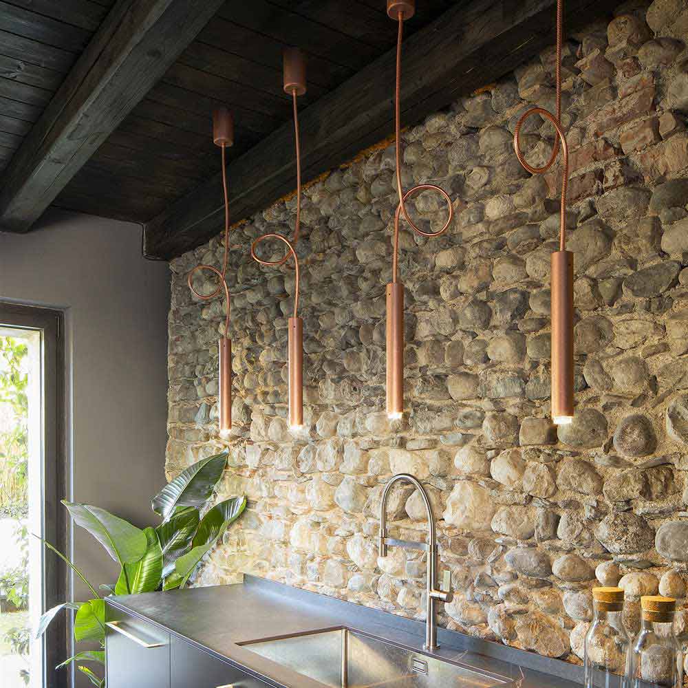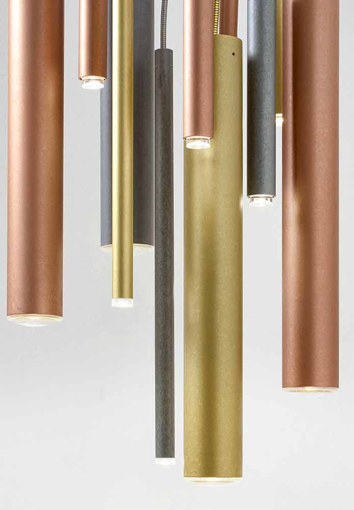 Tubò är en förfinad rörformig upphängningslampa med flexibel kabel, tillgänglig i olika material och ytbehandlingar:- hamrad aluminium;