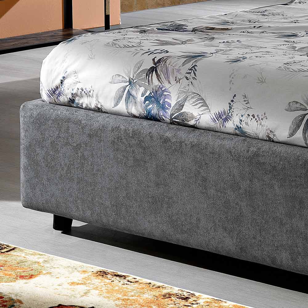 anpassning , både vad gäller mått och typ av beläggning. Sänggavelns baksida kan också täckas, för maximalt estetiskt uttryck för produkten. Faktum är att det finns en stor samling tyger, läder och ekologiska läder att välja mellan. Sängen kan även köpas i versionen med behållare. För råd och/eller personliga offerter, kontakta oss genom att använda formuläret "