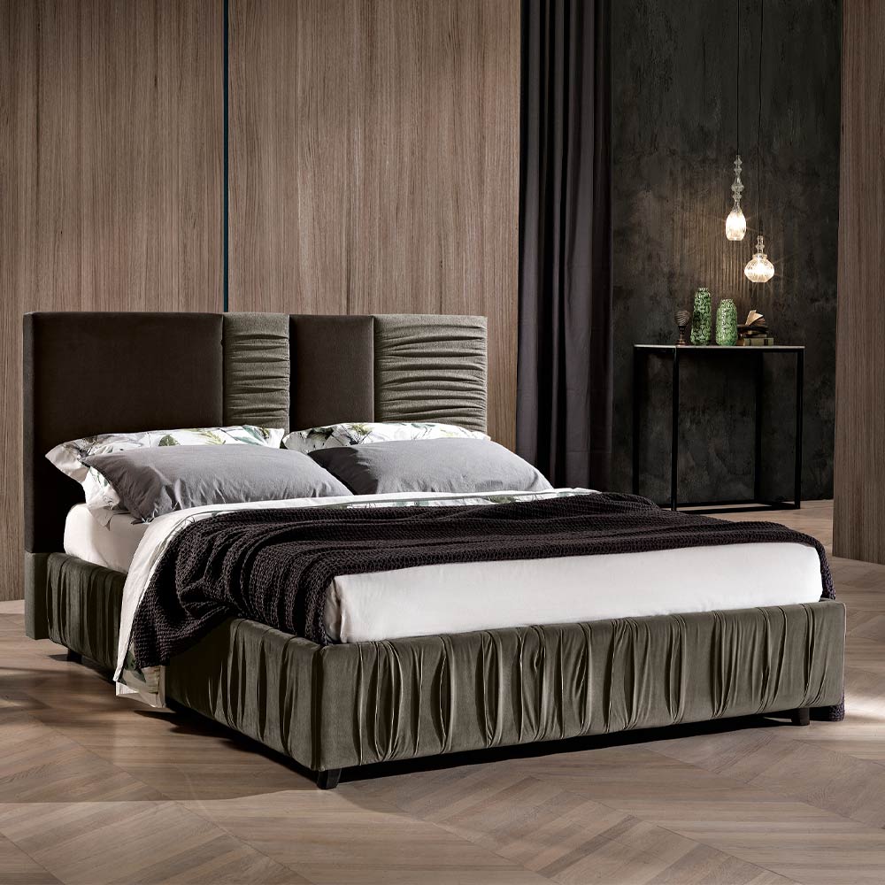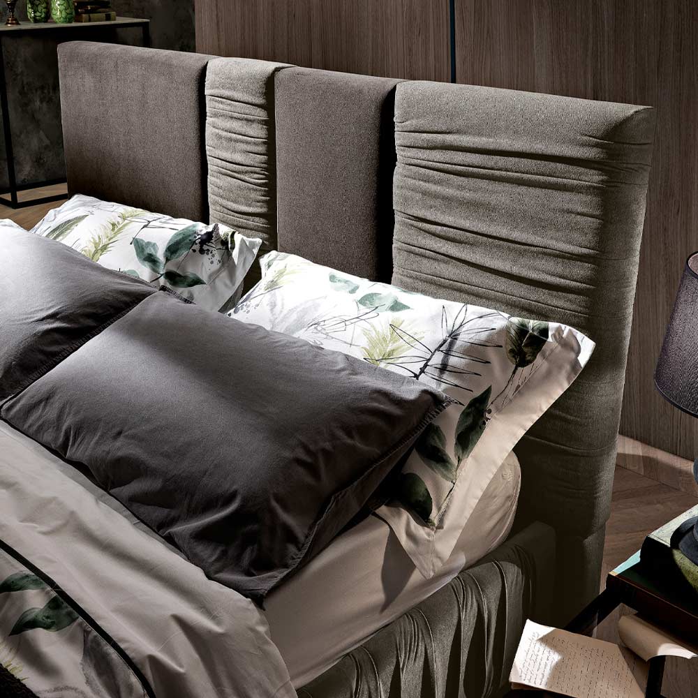 I denna dubbelsäng separeras den klassiska rektangulära sänggaveln i fyra vertikala delar av olika storlekar, som alternerar i kombinationen av olika tyger, vilket skapar en elegant taktil och visuell harmoni .