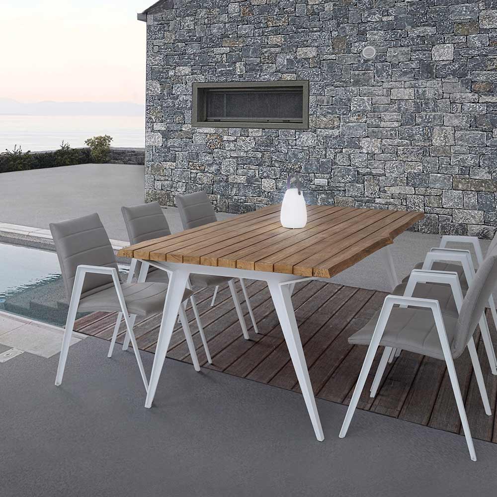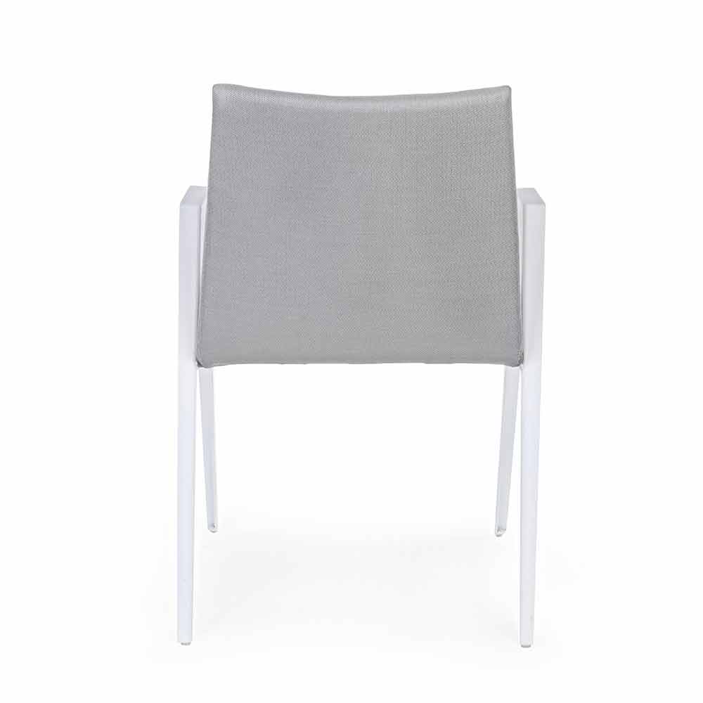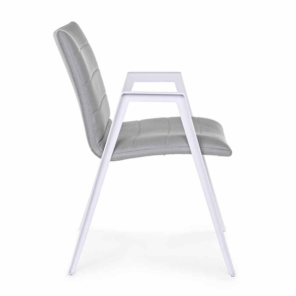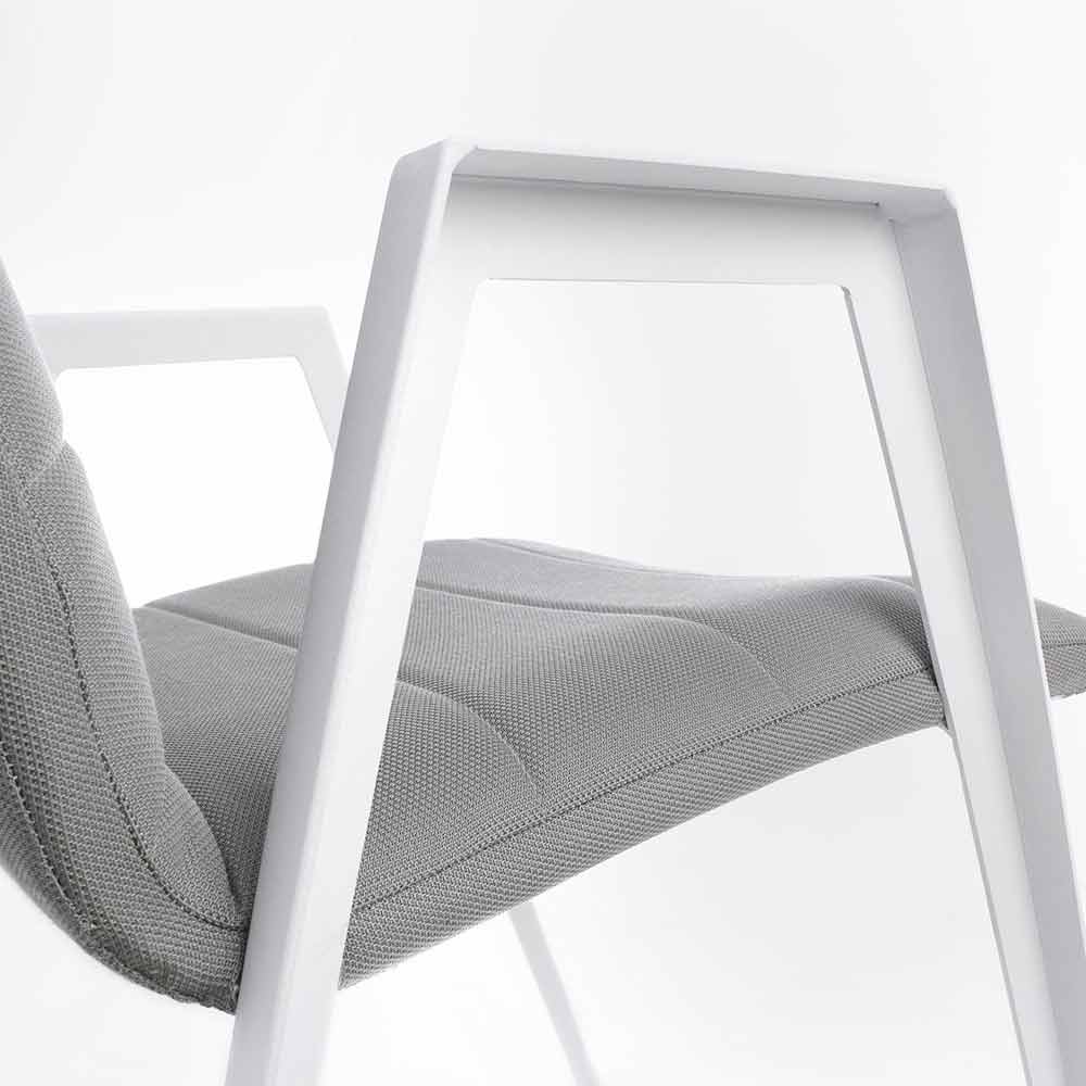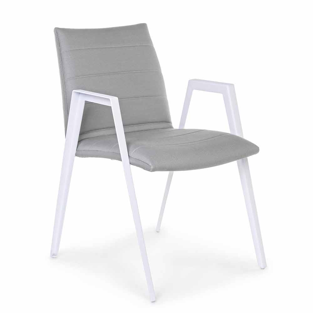 Modern utomhusstol med armstöd, ben i vit aluminium och säte och rygg i grå textilen.