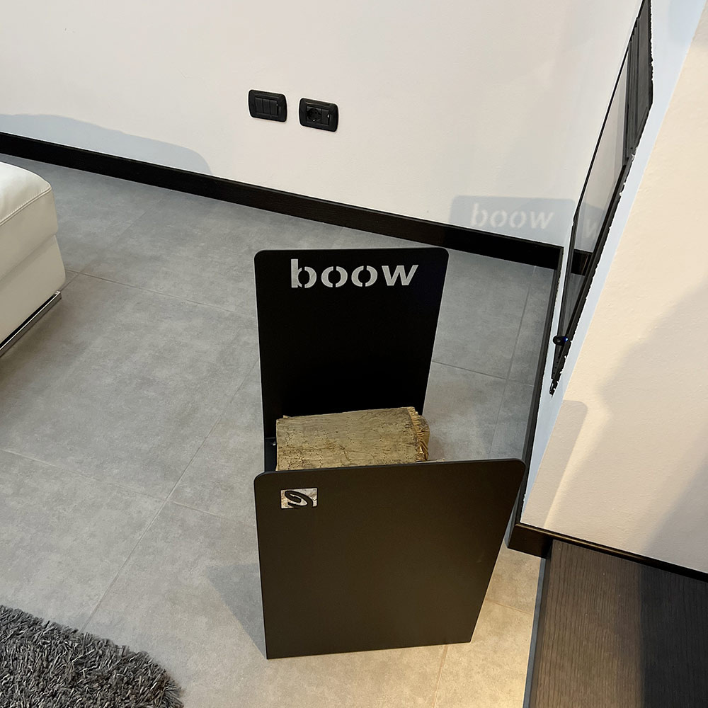 Låg timmerhållare med modern och minimal design för inomhus spis i svart stål med sidosnitt, tillverkad i Italien.