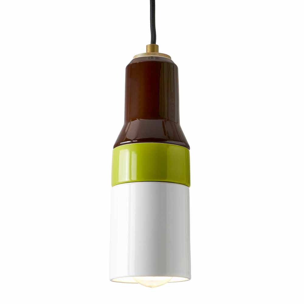 Tillverkad av brun, grön och vit keramik med svart kabel och mässingskabel.