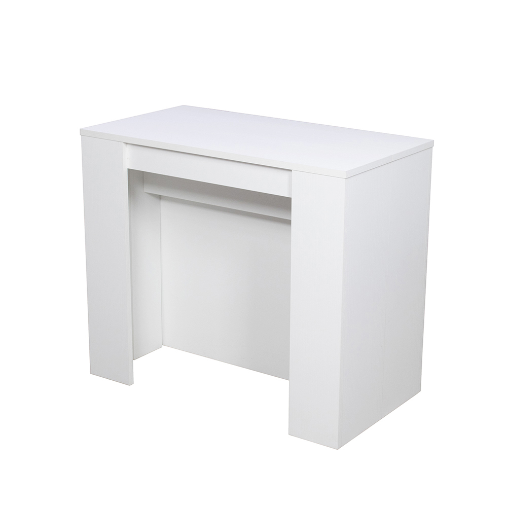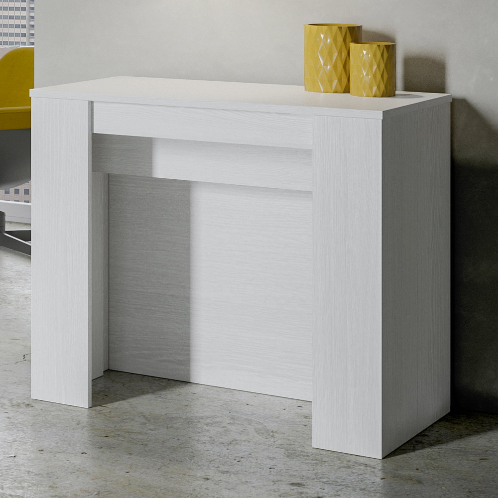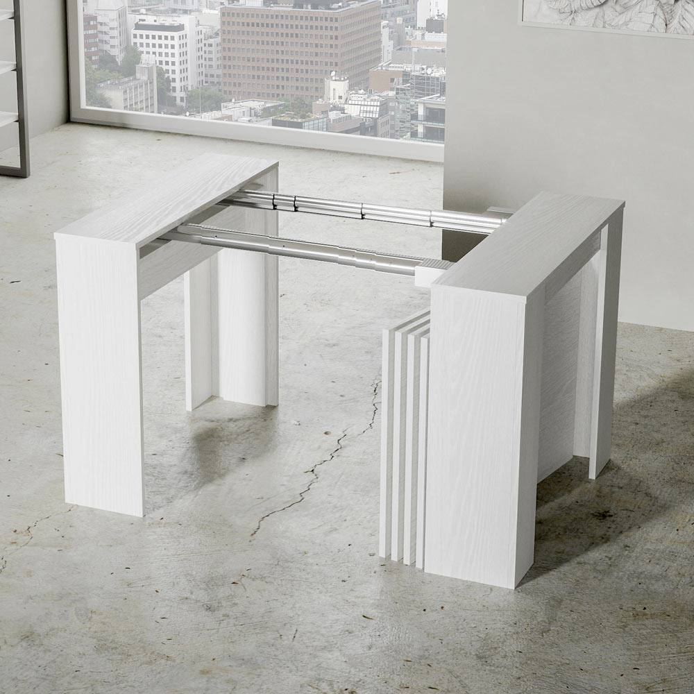 Låt dig förtrollas av renheten och funktionaliteten hos detta utdragbara konsolbord, en möbel som representerar kvintessensen av versatilitet modern.