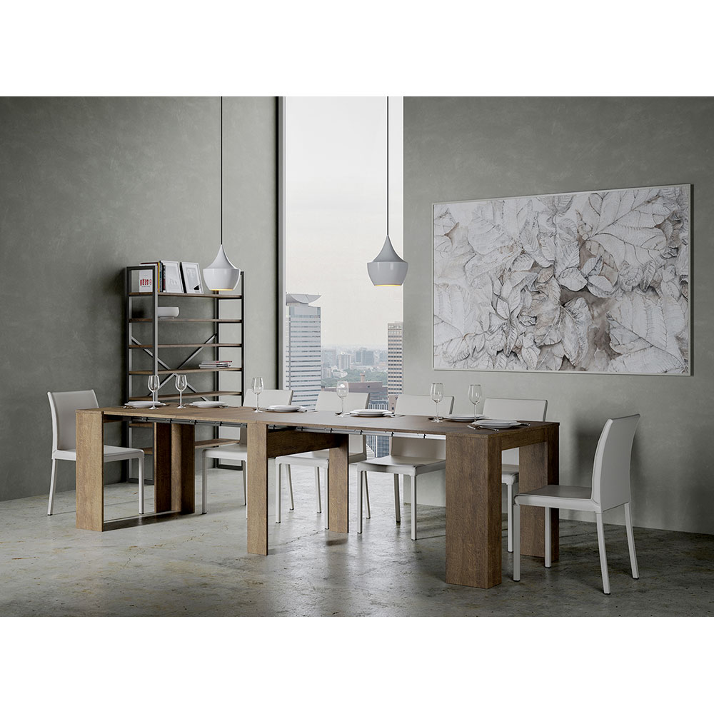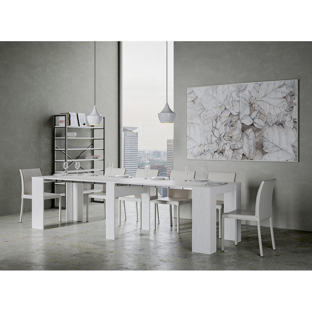 Den robusta och hållbara strukturen är utformad för att tåla daglig användning, medan dess neutrala stil matchar med elegans alla färgscheman och inredningar. Detta konsolbord är inte bara en möbel, utan en bekräftelse av stil och designintelligens, som vittnar om en förfinad smak för samtida design och en uppskattning för kvalitetà hantverk. Detta utdragbara konsolbord är idealiskt placerat i en entré, ett vardagsrum eller ett kontor och är en inbjudan att uppleva ditt hem på ett dynamiskt och kreativt sätt.