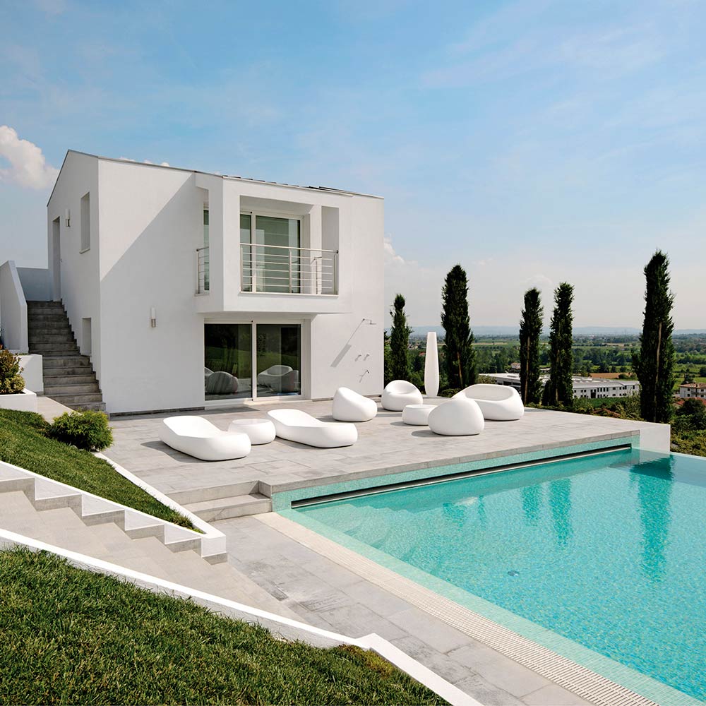 polyeten , som finns i den ogenomskinliga versionen som kännetecknas av utmärkt motståndskraft mot solen, stötar och värme eller i den resistenta och ljuslackerade versionen som gör att du kan skapa lek av ljus och reflektioner. Tack vare sin unika och innovativa design lyckas den kombinera funktionalitet och funktionalitet utan att försumma den visuella och designaspekten.