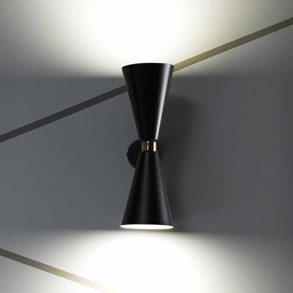 Denna vägglampa tillverkad helt i Italien, är gjord av matt svart metall berikad med guldfinishdetaljer .