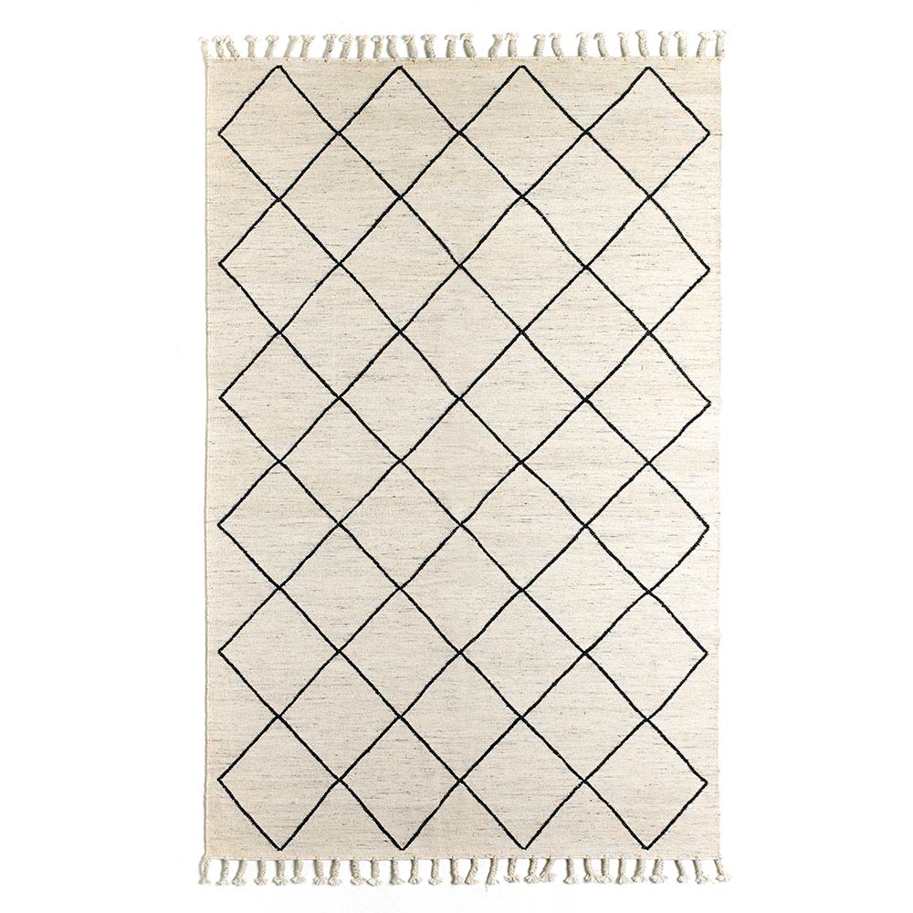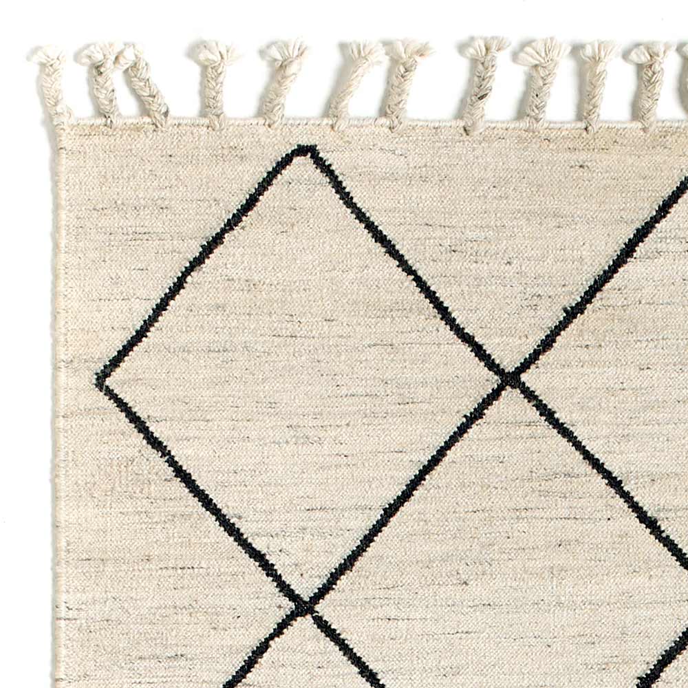 geometriska mönstret i nyanser av svart som ger modernitet tillsammans med fransarna som täcker de två kortare sidorna på mattan. Materialen och teknikerna som används gör det möjligt att få en slutprodukt av hög kvalitet som kan uppmärksamma sig själv, vilket gör varje miljö unik.