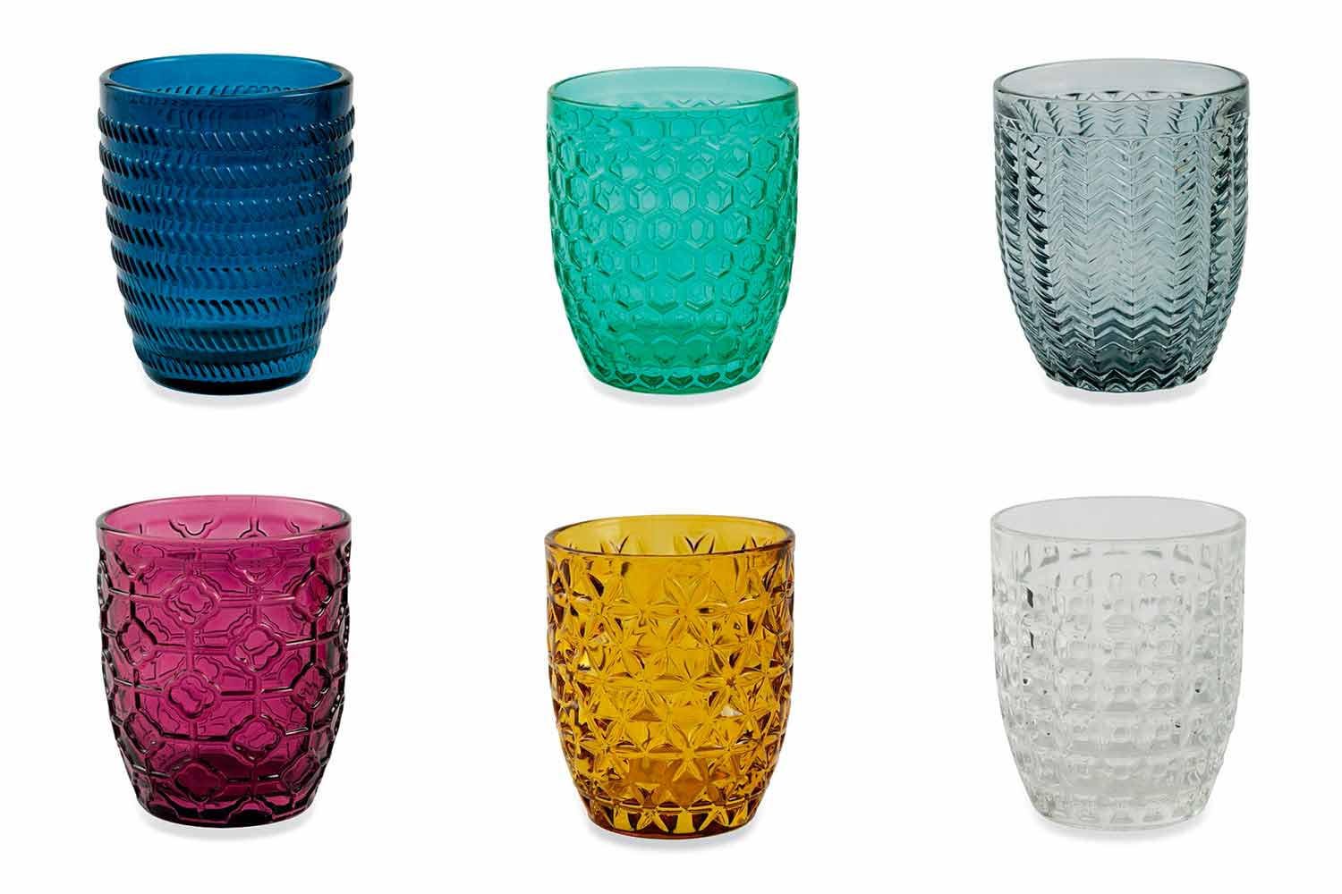 Moderna färgglada glas dekorerade exponeringsglas som serverar från vatten.