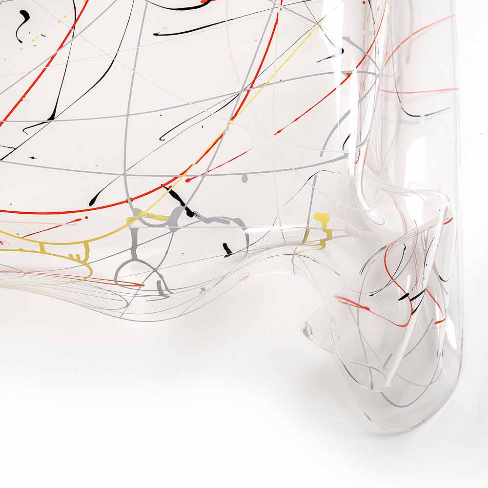 Ett ark med ren jungfrupolymer 100% av PMMA plexiglas med sprayfärgfartyg; Det draperas för hand vid höga temperaturer, för att skapa ett unikt och oreperatabelt bord. Den byggda strukturen är helt självbärande.