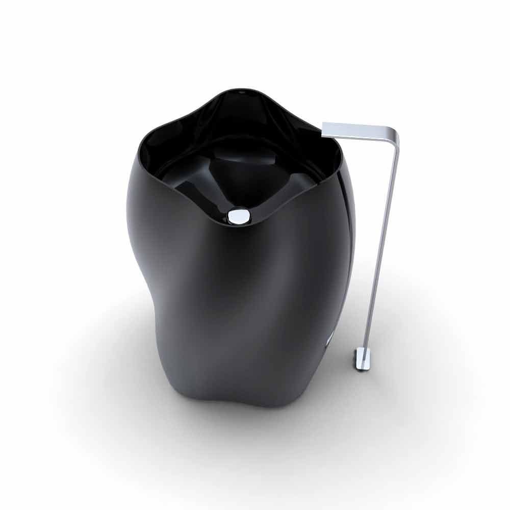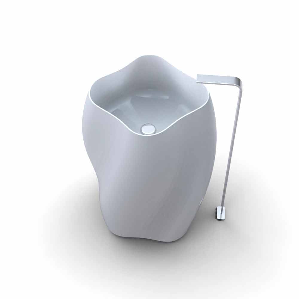Fristående tvättställ med slingrande och organiska former, i Solid Surface; Dess linjer visar en profil som påminner om silhuetten av en "exotisk" blomma. Förutom den "vågiga" sidoprofilen har den en något "vriden" form på sig själv, smal mot toppen för att visa en singulär fyrsidigt formad bassäng med flikar. Den senare presenterar sig själv som ett ytterligare element av karaktärisering och en grundläggande geometrisk figur, som genererar hela kompositionen. Även sanitetsgodset har bra ergonomi, då det är ganska rundat, finns i två olika färgvarianter: Vit (RAL9003) eller Svart (RAL9005).