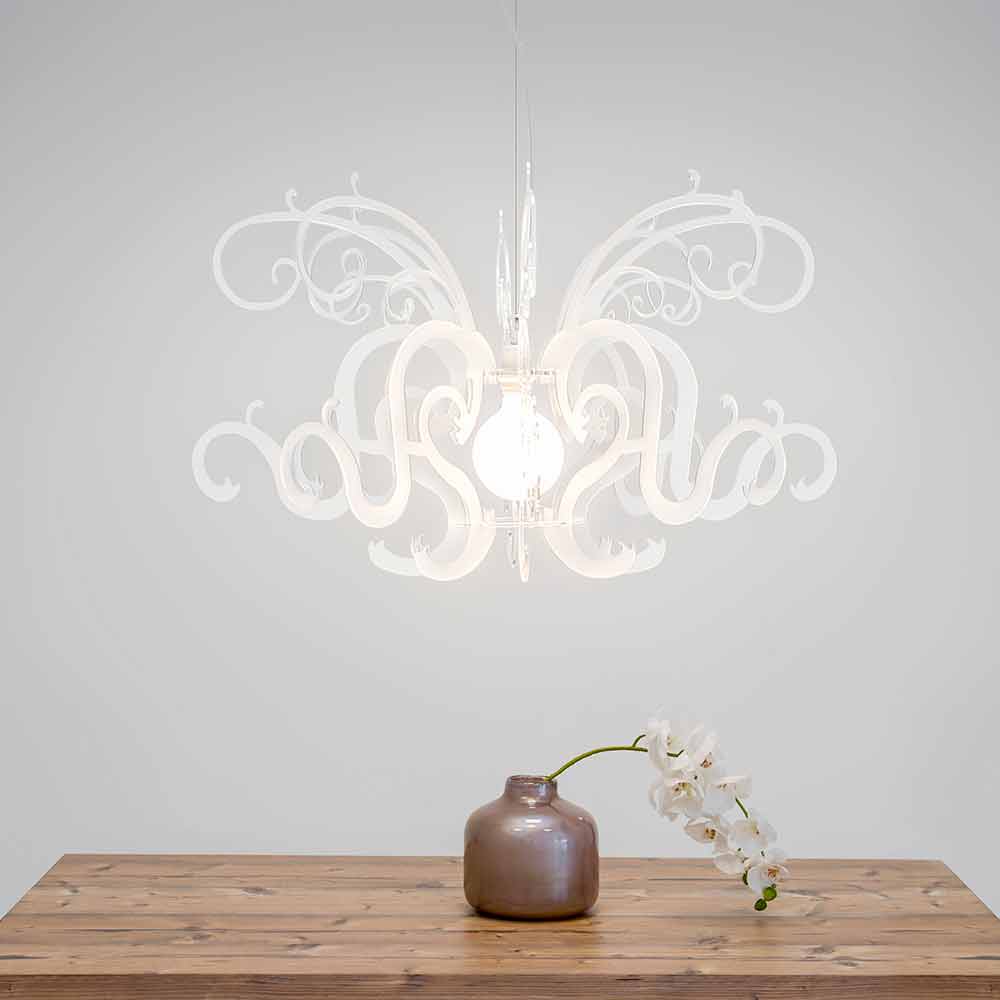 Malito är en majestätisk ljuskrona gjord av jungfrumpolymer PMMA plexiglas i vitt eller svart.