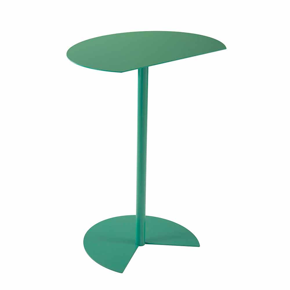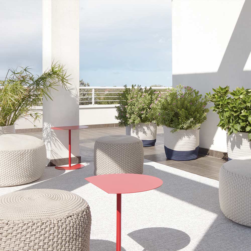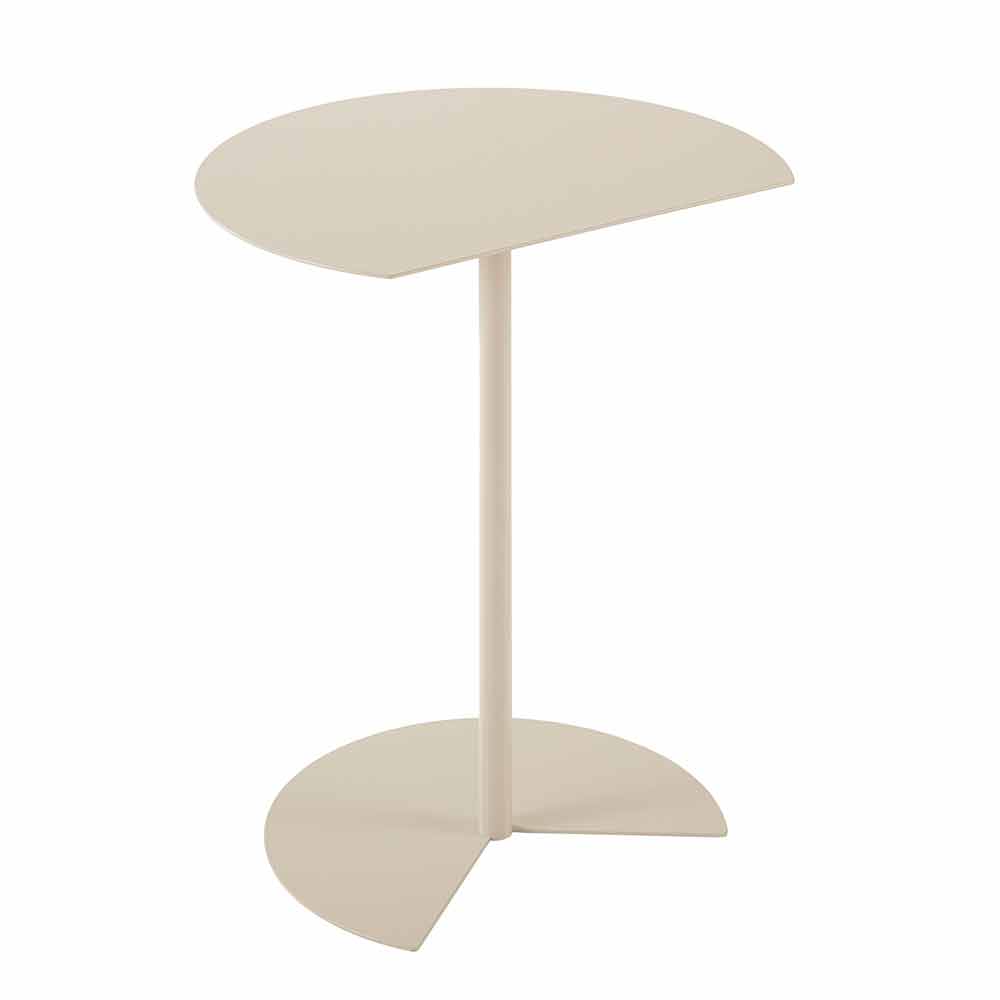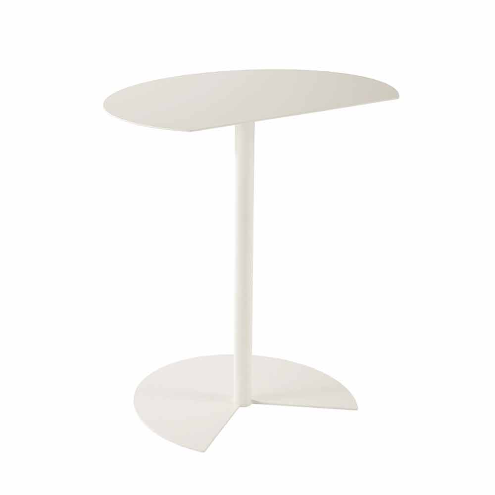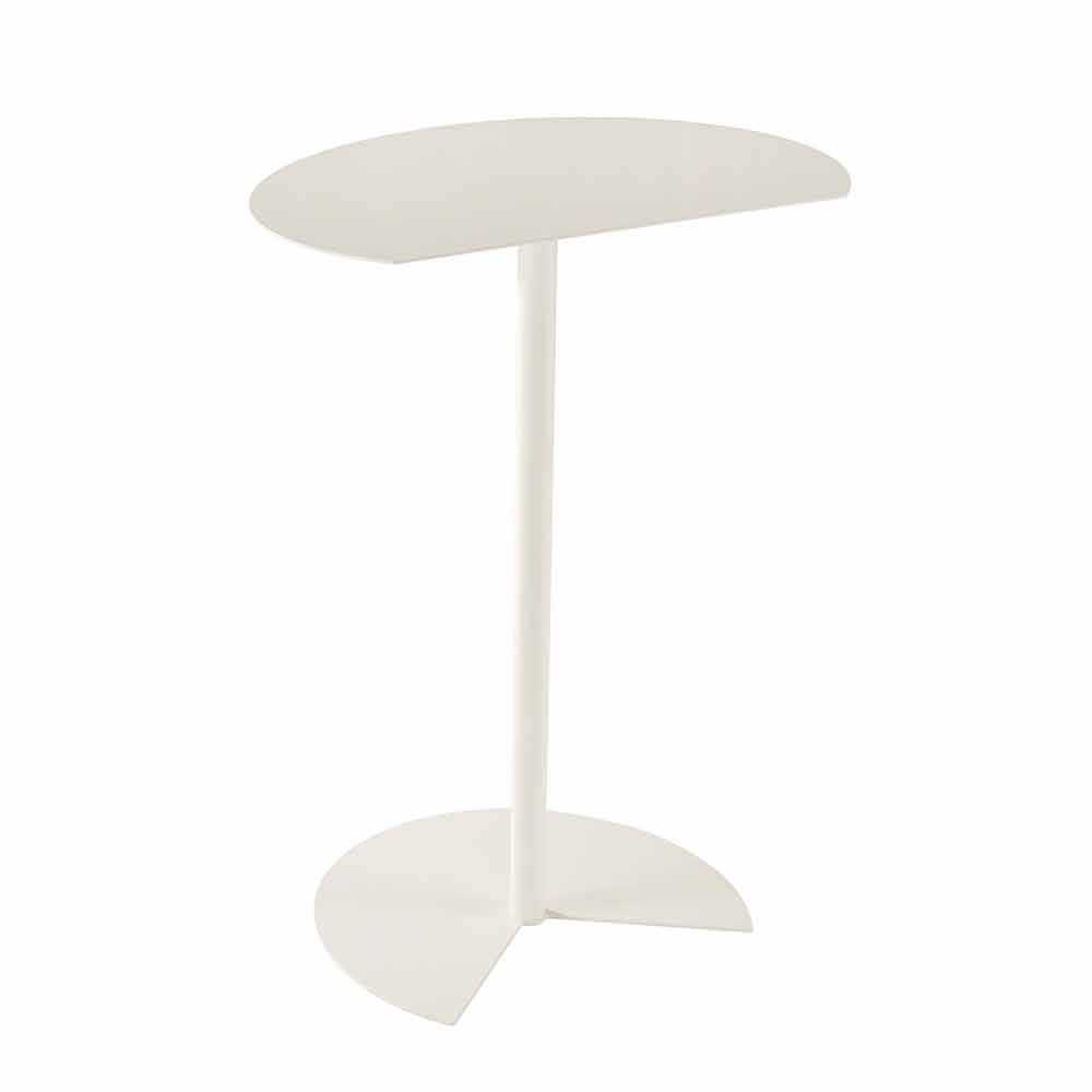 soffbord utomhus kännetecknas av stödytan som påminner om cirkelns rundhet bruten av ett rent snitt så att det kan placeras fäst på en vägg, för att optimera utrymmet eller kopplas till en liknande, till en mycket funktionell
