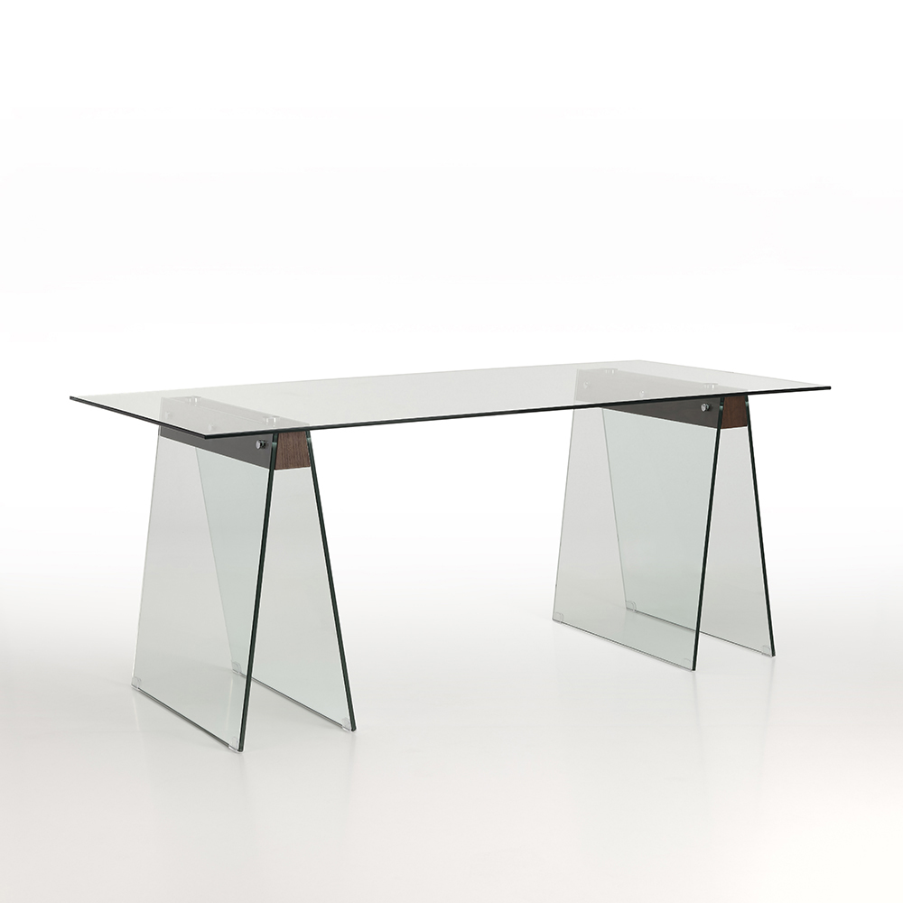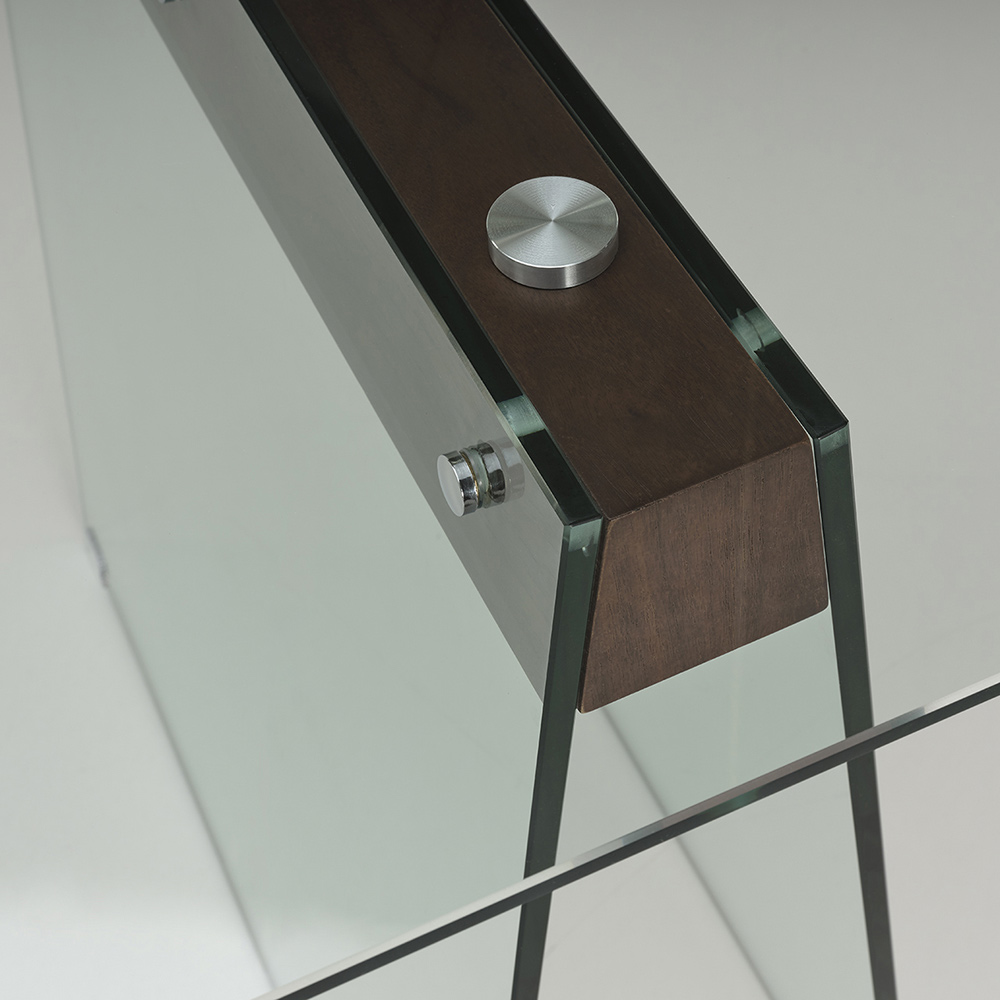Losanna är ett bord i modern stil med ben i klarglas och en 12 mm tjock skiva i klarglas med valnötsfärgade MDF-inlägg.