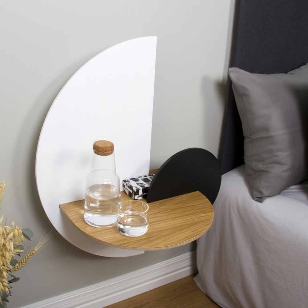 Vad som kännetecknar detta nattduksbord är dess innovativa och originella design som kan revolutionera inredningen i alla sovrum som behöver en touch av personlighet och elegans . Dess struktur har enkla geometriska linjer som ger produkten unikhet och harmoni mellan formerna. Dess struktur är gjord genom användning av tre plywoodpaneler, varav en i ekfinish fäst vid väggen som fungerar som en riktig stödyta och två i svartvitt färgad askfinish som är monterad på den och som tillåter upp till 8 olika konfigurationer så att du kan få en produkt som kan anpassas efter dina behov.