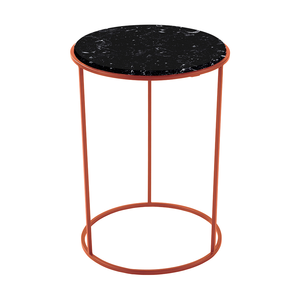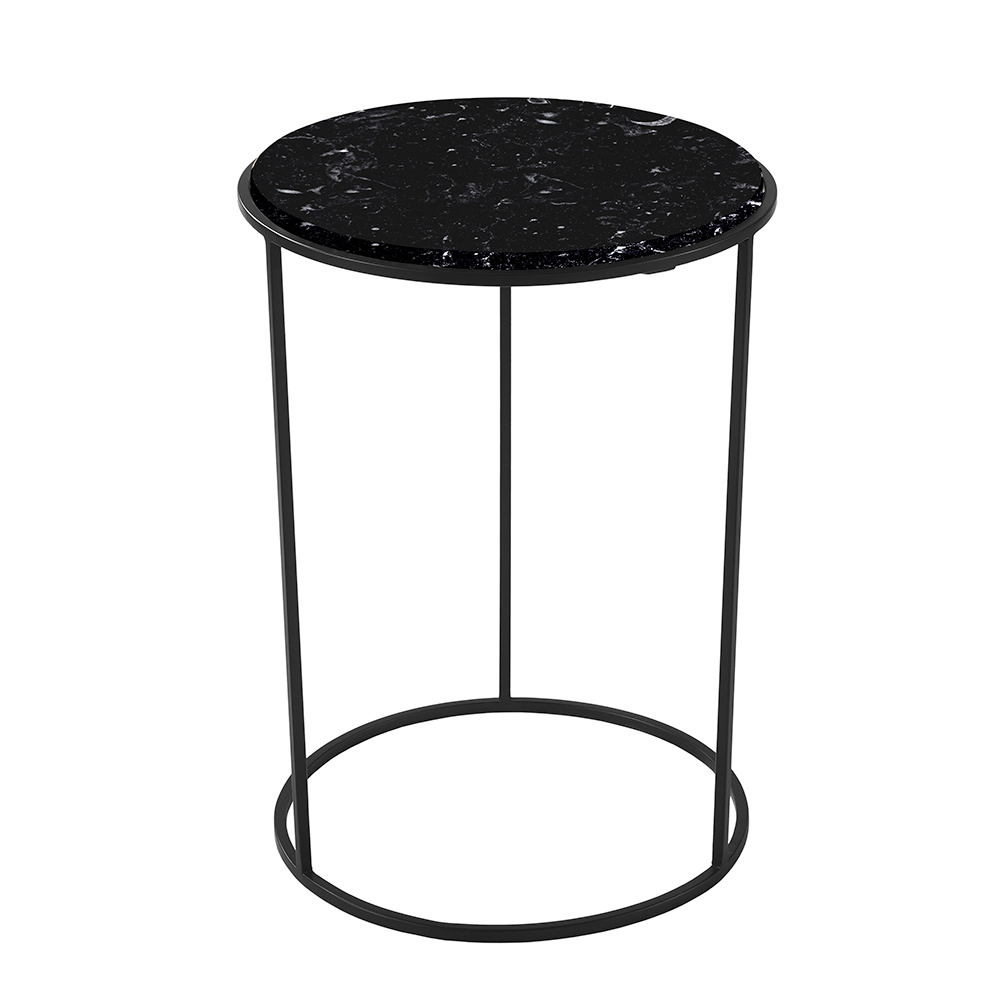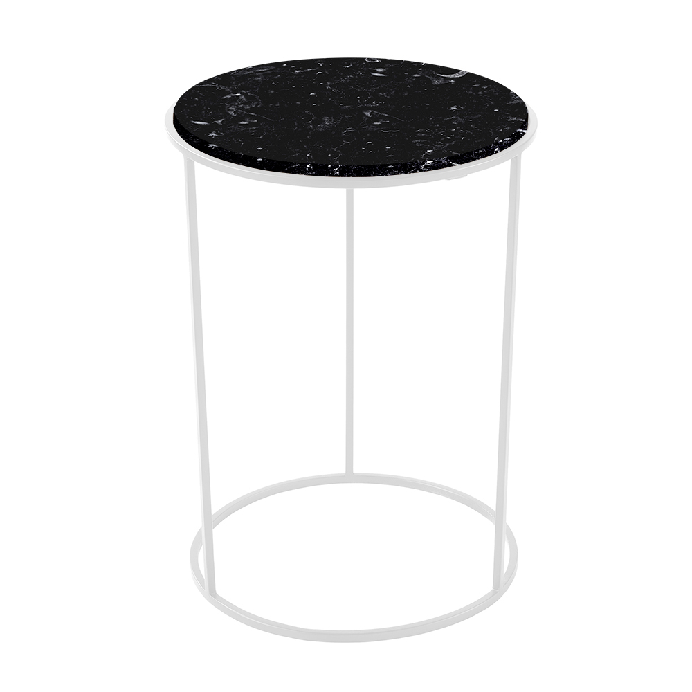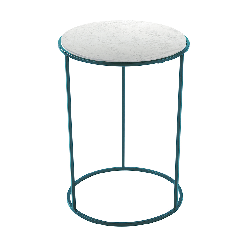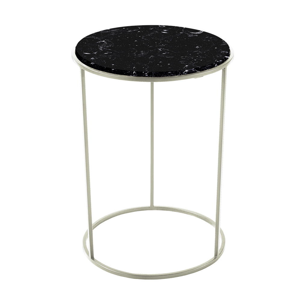 runda soffbord med ogenomskinlig marmorplatta, som finns i tre olika varianter, har minimala och väsentliga linjer. Den
