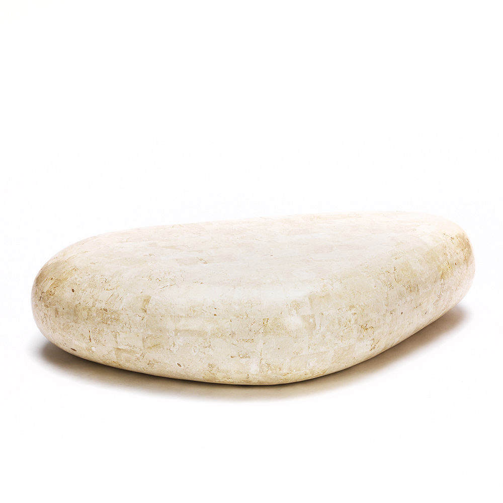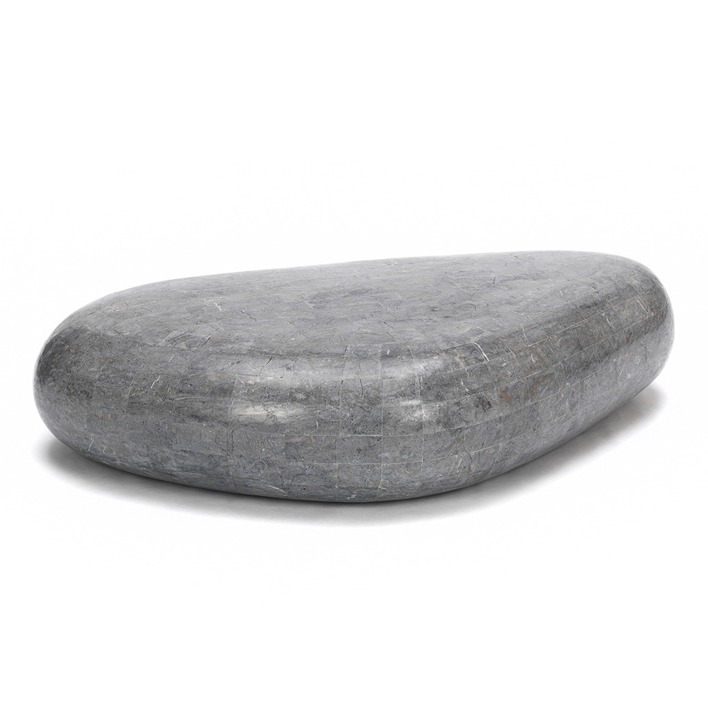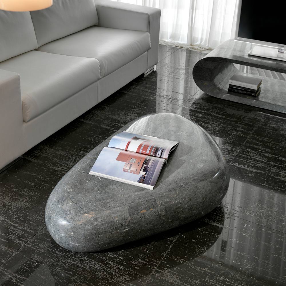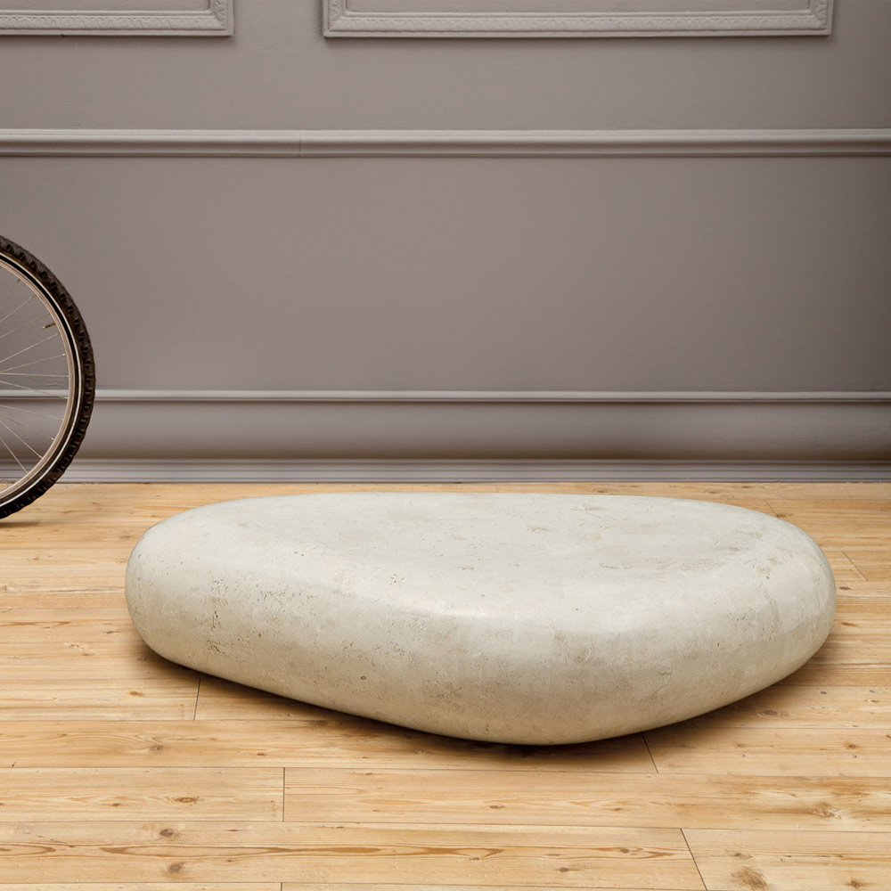 Detta soffbord designat för vardagsrummet har en enkel och viktig design. Bestående av ett trekantigt fossilt stenblock.