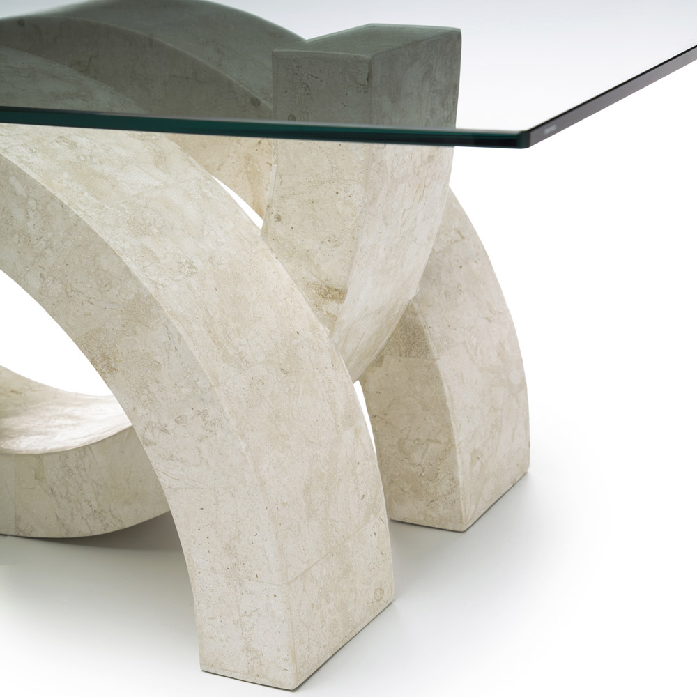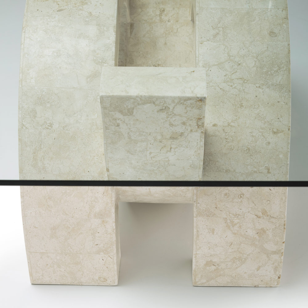 Klassicism och modernitet möts i Austins soffbord och skapar en extremt intressant stilistisk kontrast. Glasets lätthet låter den fossila stenstrukturen som stöder det lysa igenom: en robust men dynamisk sammanflätning av rundade linjer.