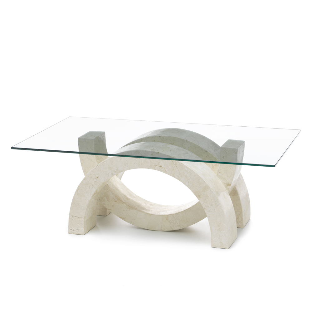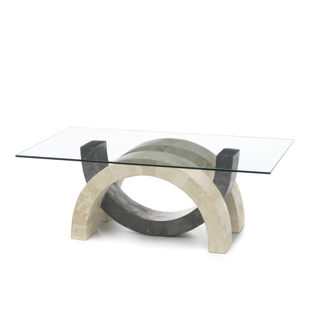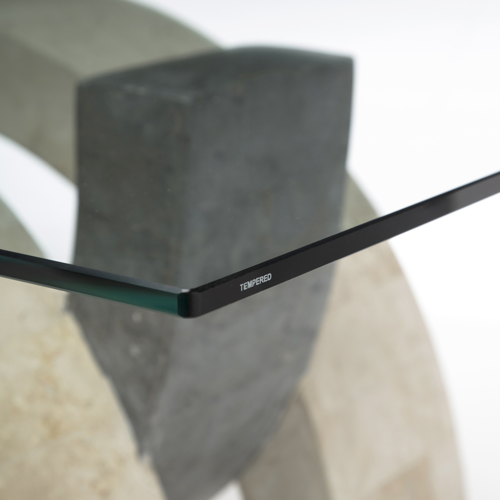 Modernt soffbord i sten och 10 mm glasskiva, polerad kant.