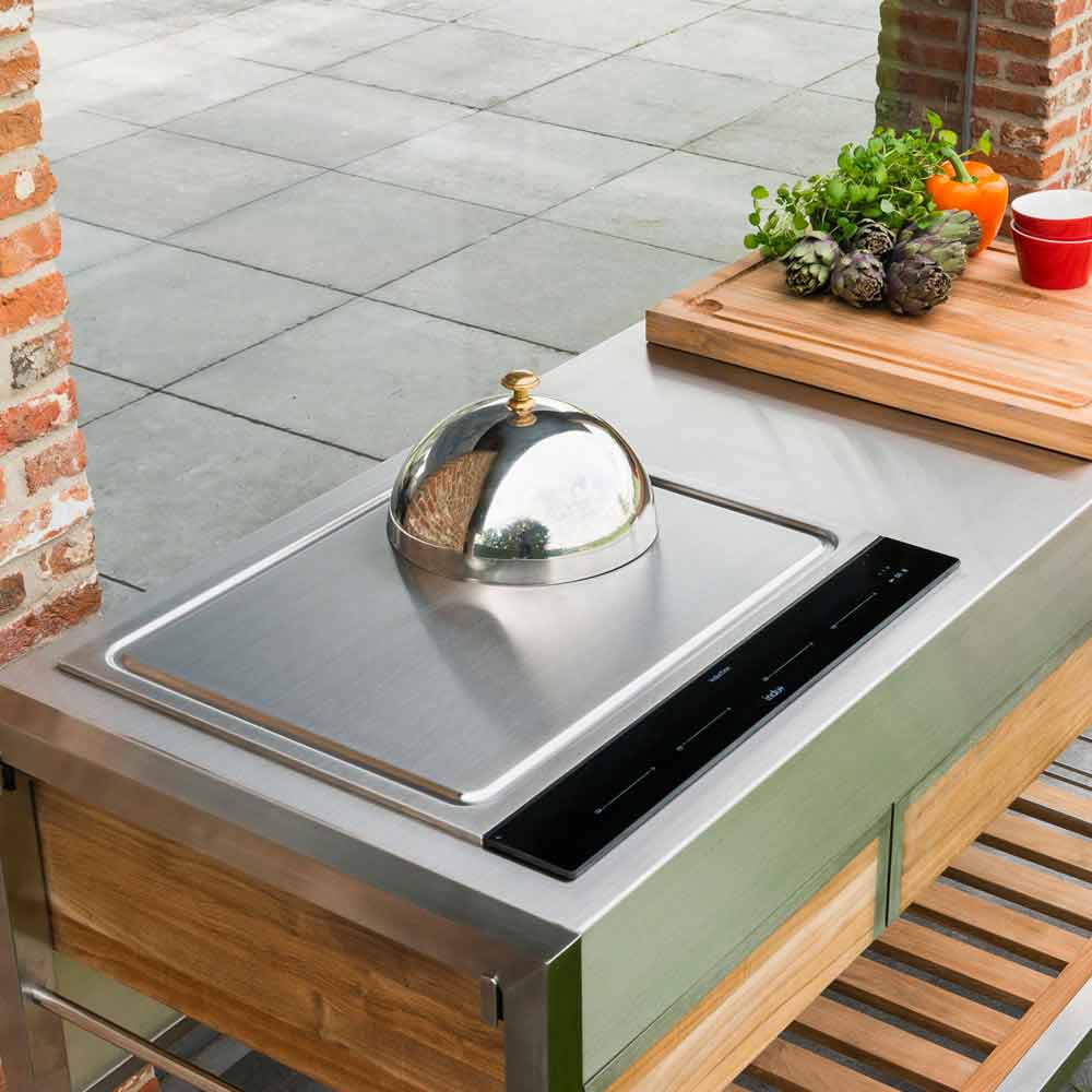 Utekök på hjul i rostfritt stål och teak, två storlekar av modern design med utbytbara tallrikar.