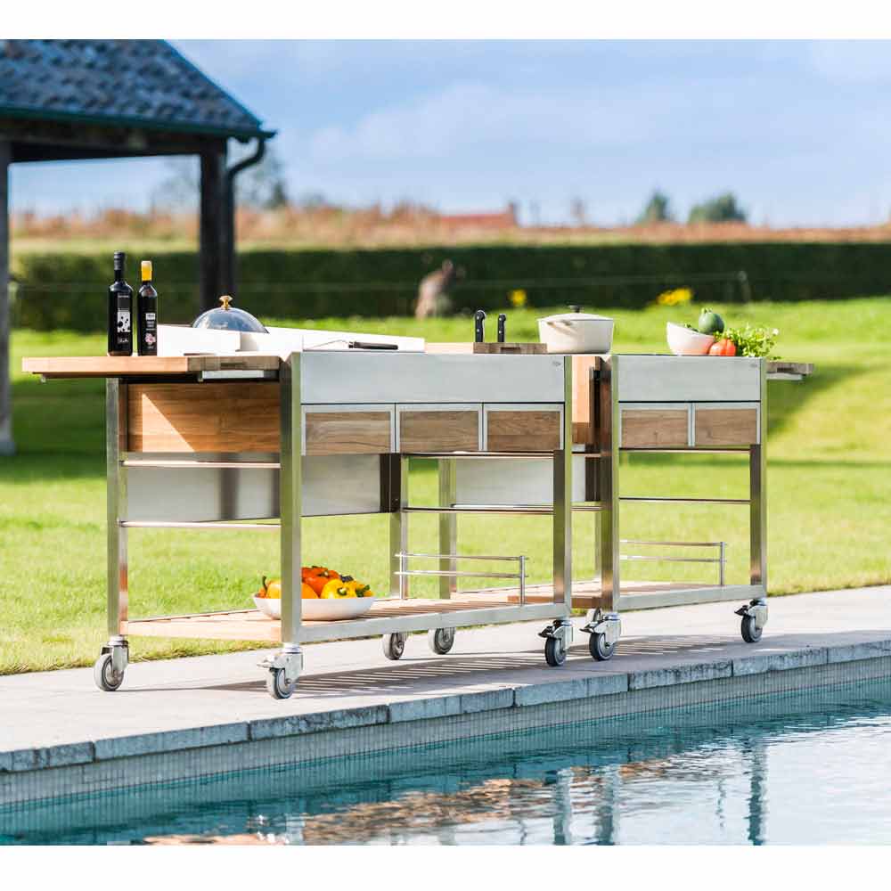 Det är ett utekök på hjul som kännetecknas av en robust struktur som använder borstat rostfritt stål och massivt teak , som du kan placera var du vill: i trädgården, på terrassen eller vid poolen, för en lyxig och trendig effekt.