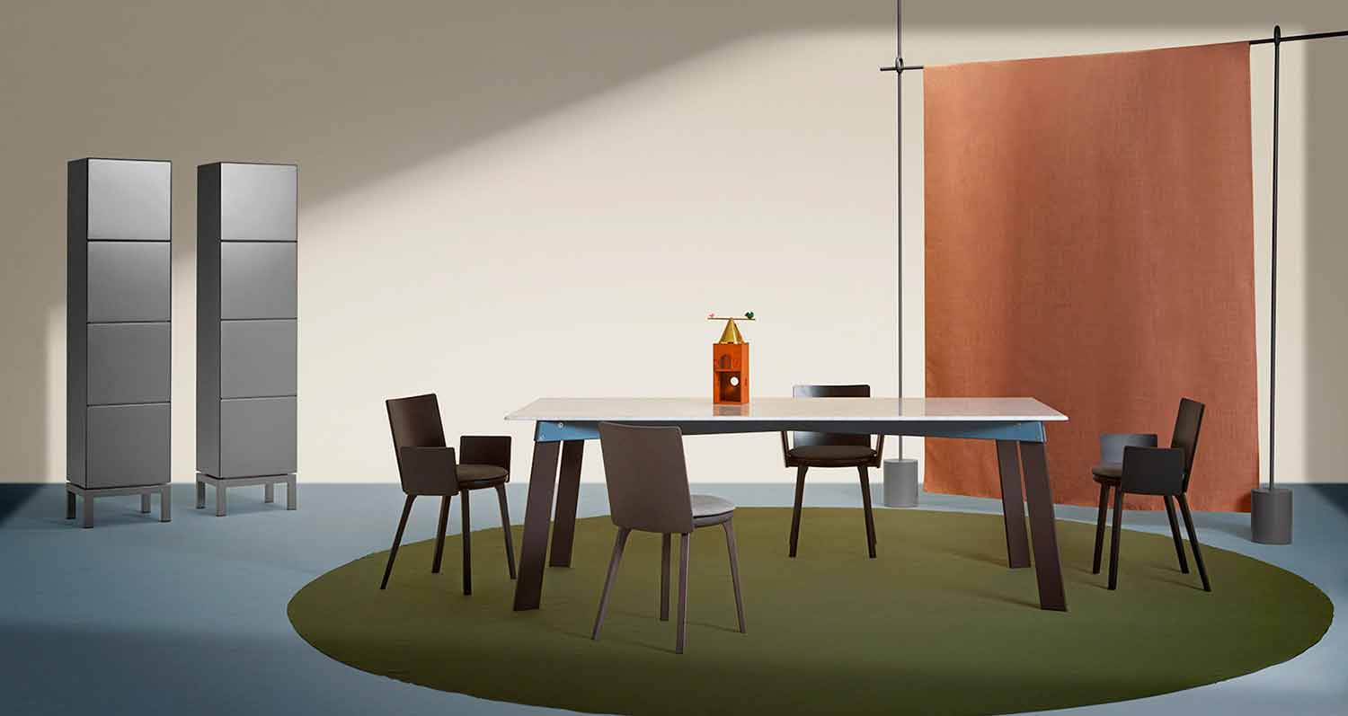 Original och funktionell , gaffeldesignen av ståländarna möjliggör införande av benen, även i stål, med ett enkelt monteringssystem. En teknisk och praktisk detalj som också blir estetisk: skarvskruvarna och valet av matchande eller kontrasterande färger framhäver den och skapar en