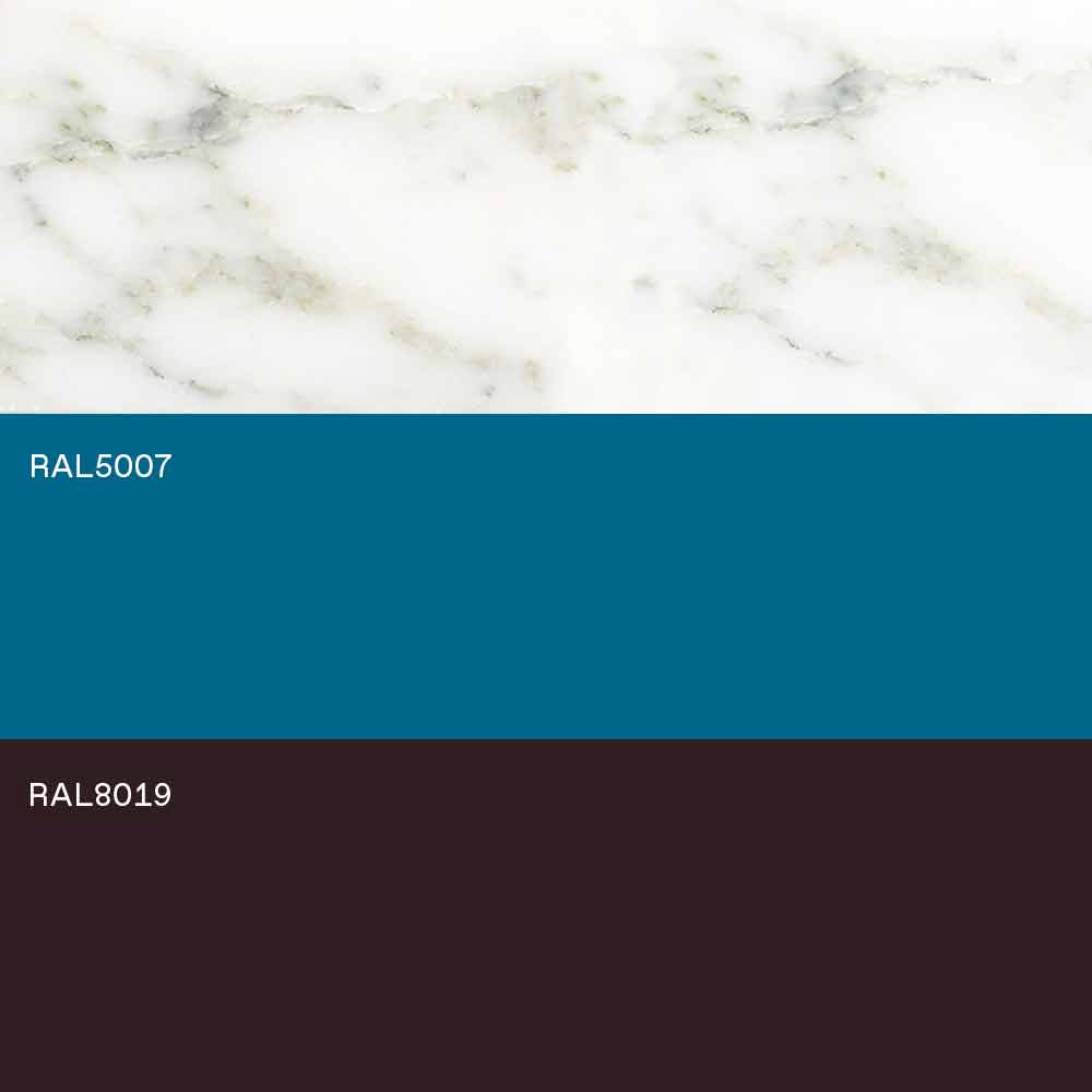 Finish : kaffe RAL8019 + kors i ljusblått RAL5007 + topp i vit Michelangelo-marmor