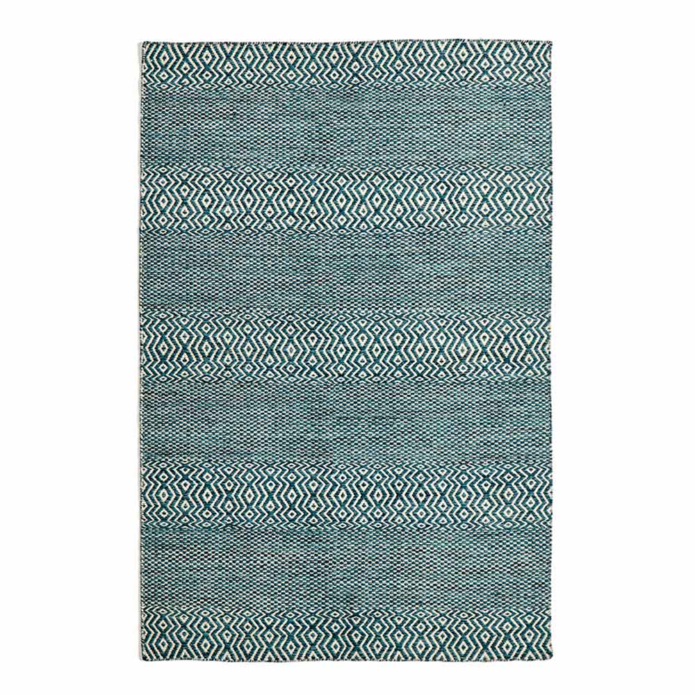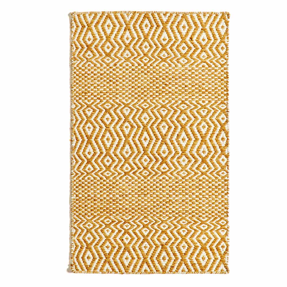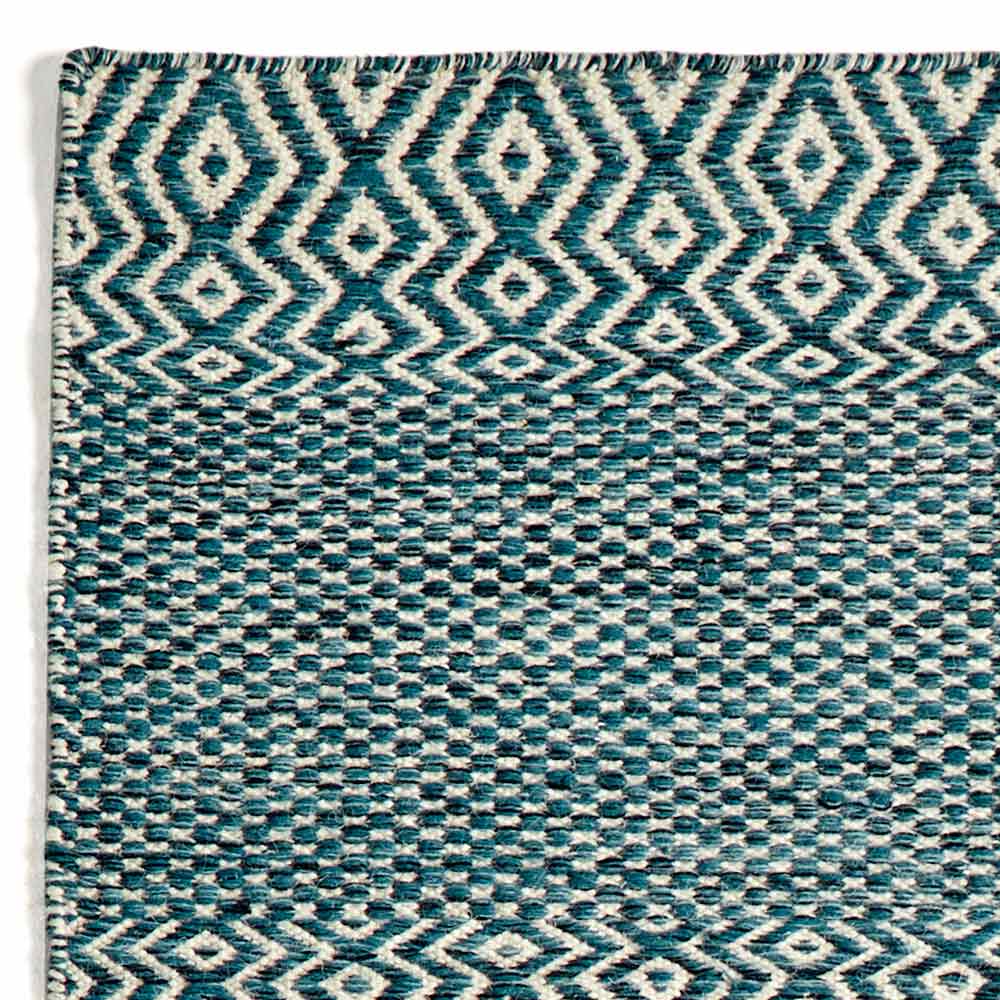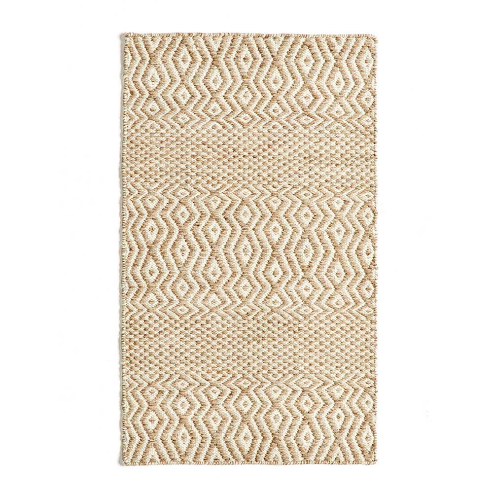 Handvävd vardagsrumsmatta i ull och bomull med mönstrad design.
