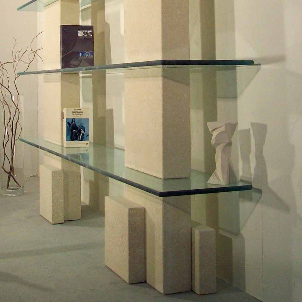 Modulär bokhylla Gjord i Italien i sten och glas. En linjär och väsentlig komposition som med sina rena och polerade ytor eliminerar kompromiss med de skulpturala och dekorativa formerna. Poplia bokhylla visar att Vicenza sten är ett modernt, ljust och varmt material, strukturen består av modulära element på 35 cm i höjd med 4 glashylsor med grova kanter. En intern säkerhetsstruktur garanterar maximal stabilitet i strukturen.