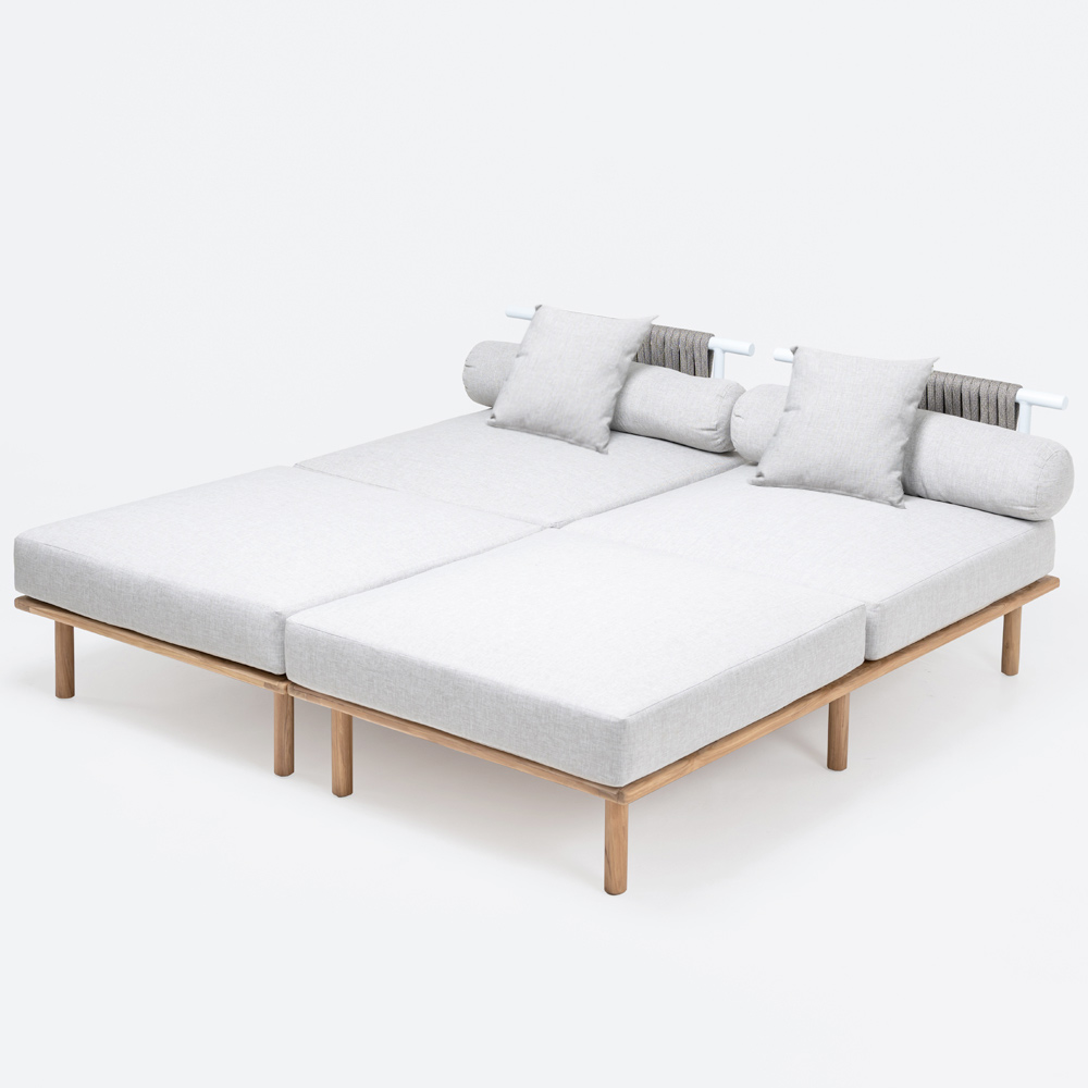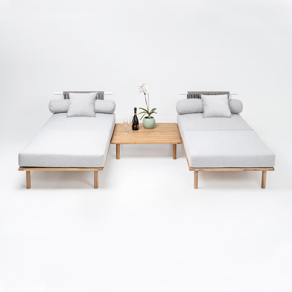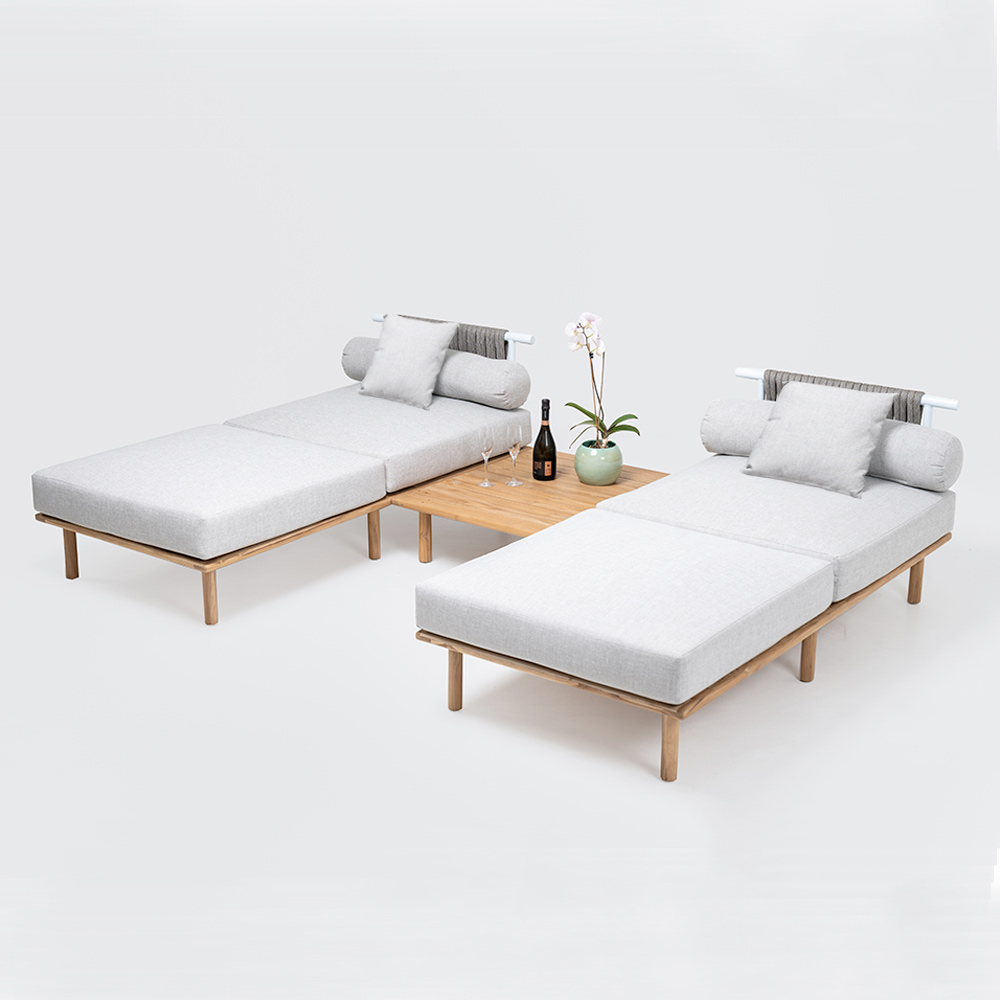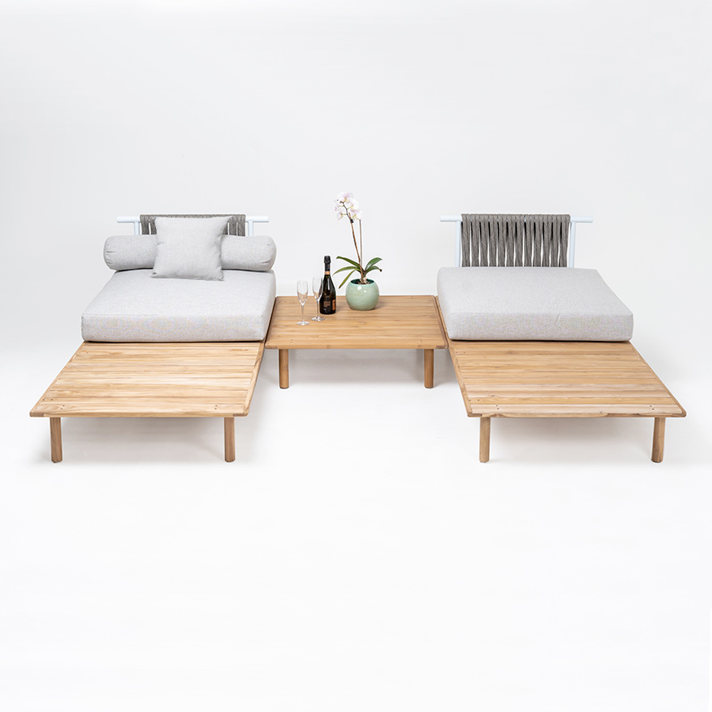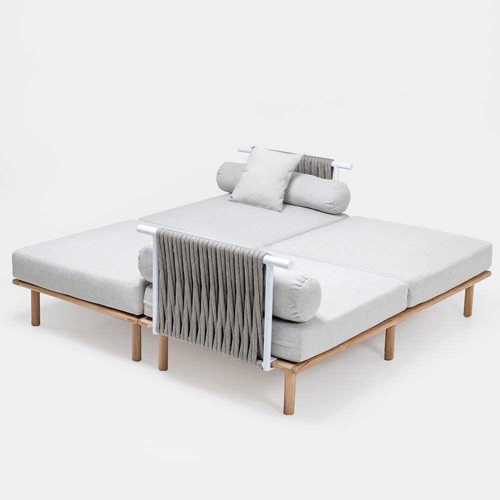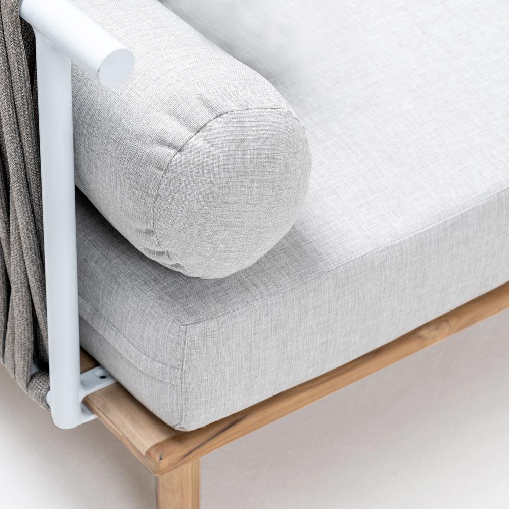 Modulär trädgårdssoffa i teak, ryggstöd i aluminium och väv i Olefin/PP ROPE och kudde