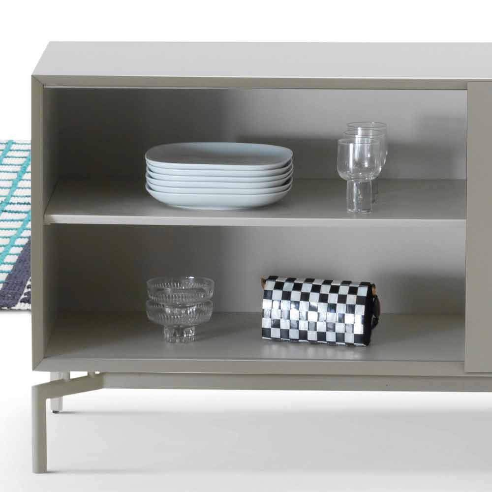 Skänk i matt duggrålackad MDF med varmgrålackat öppet fack.