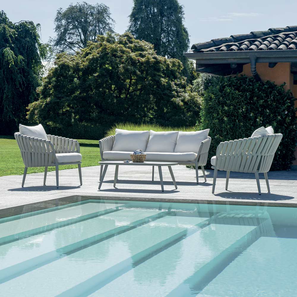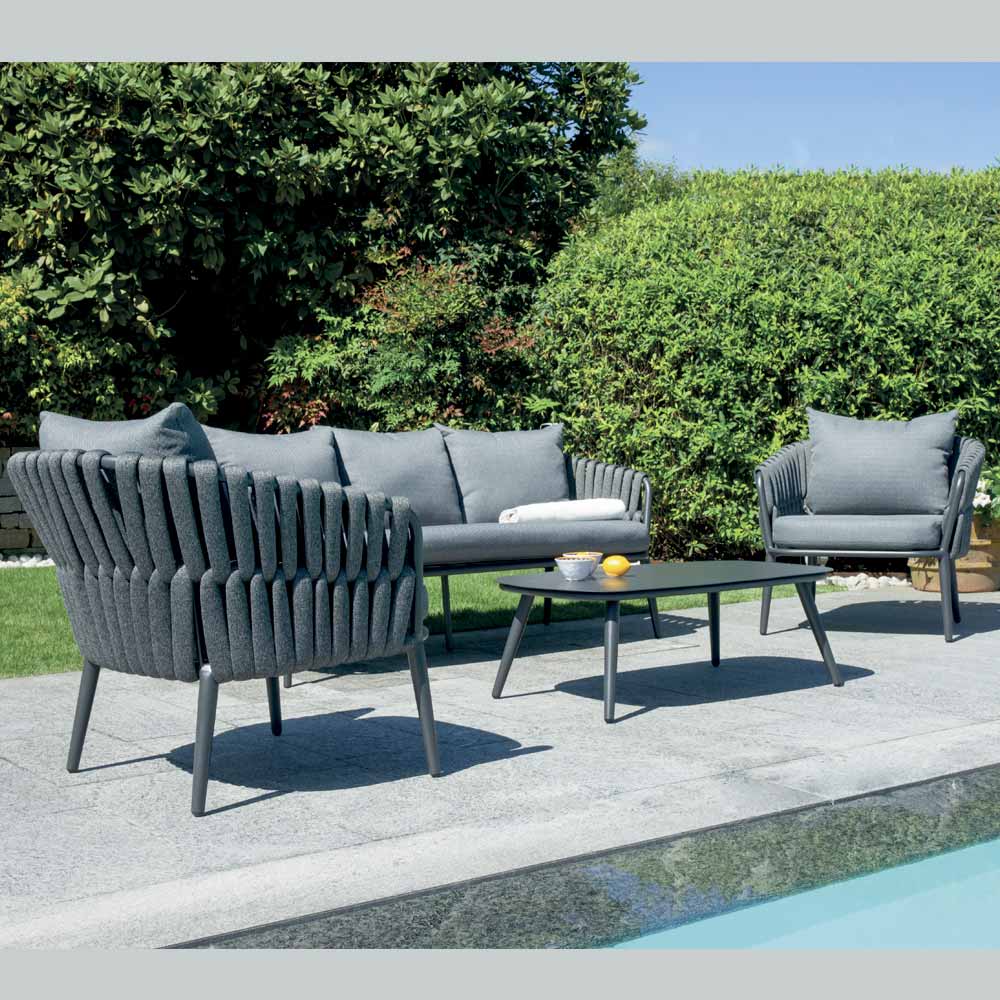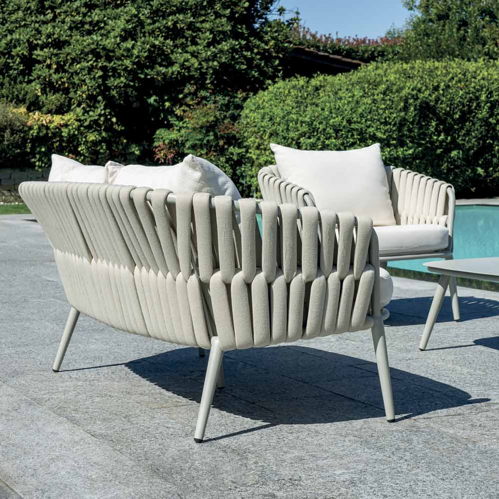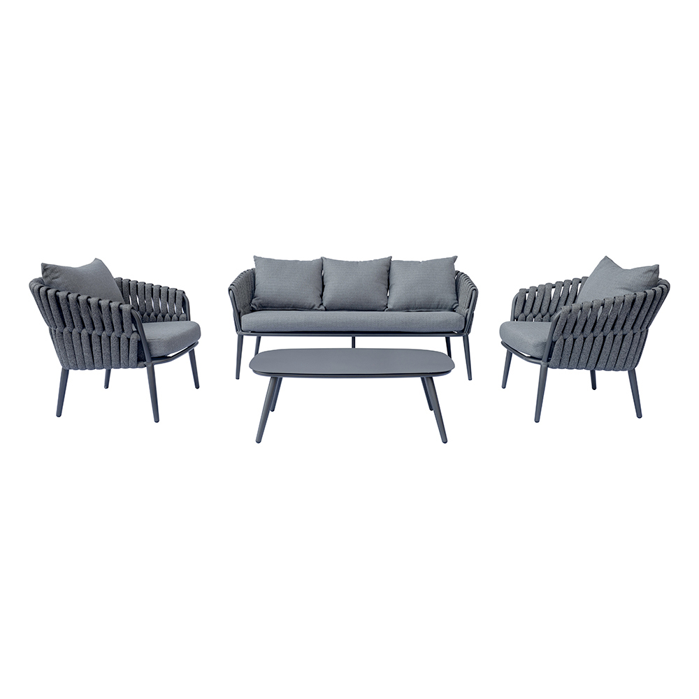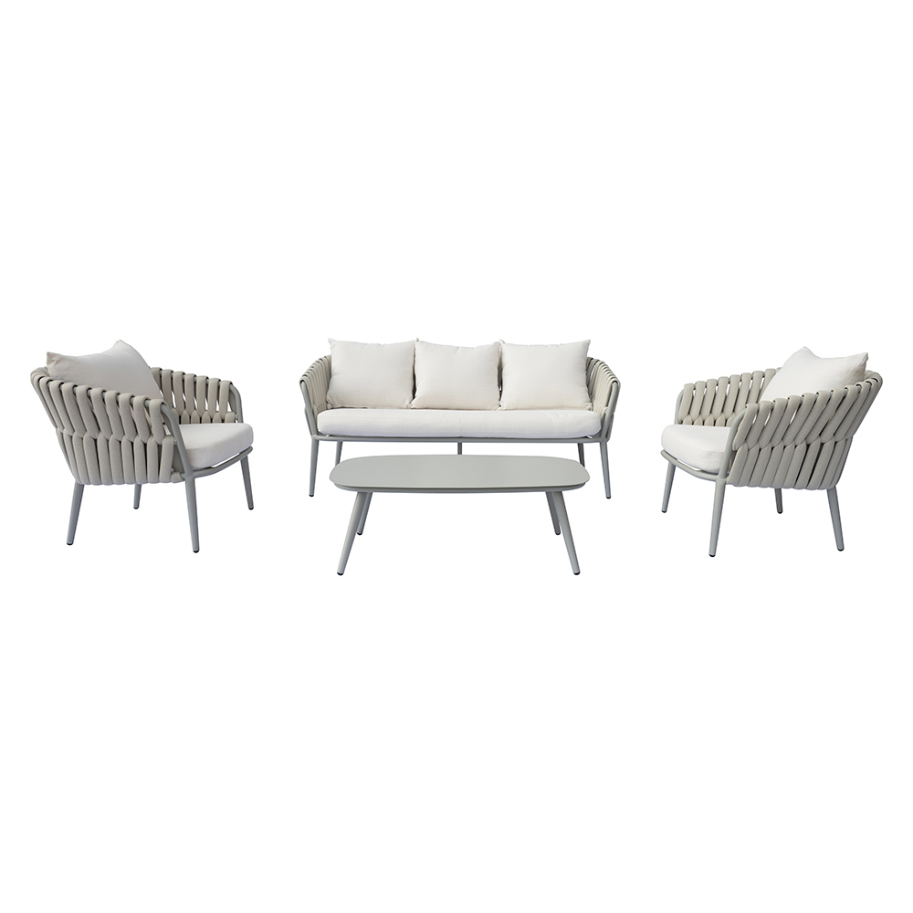 Aluminiumramen garanterar lätthet och hållbarhet, medan vadderat rep lindas runt sitsar och ryggstöd, vilket ger en modern men ändå bekväm touch. De avtagbara kuddöverdragen säkerställer praktiska egenskaper och enkel rengöring, vilket bibehåller vardagsrummets eleganta och raffinerade utseende över tid.