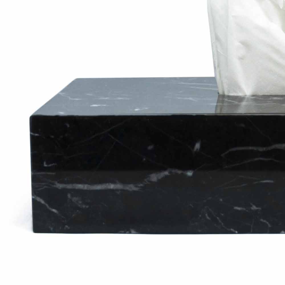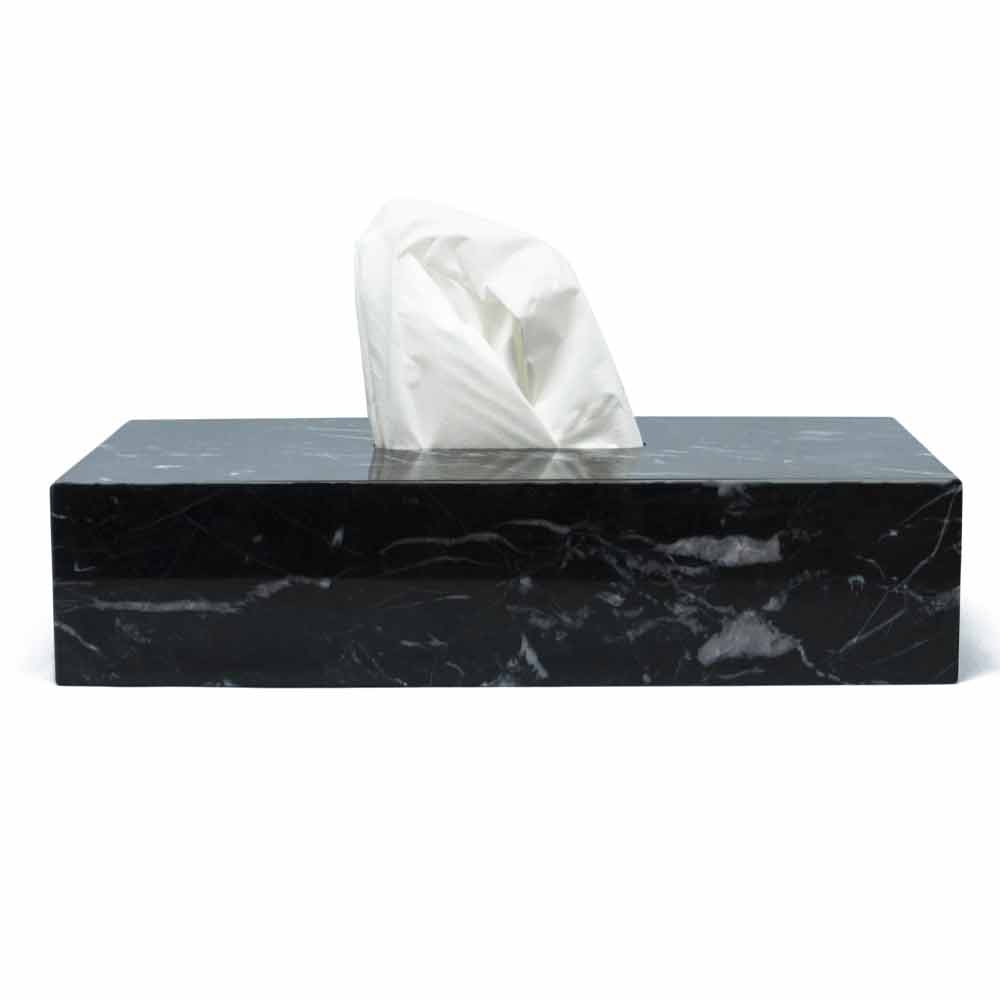 Praktisk behållare för mjukpappershållare finns i den rektangulära versionen helt tillverkad av svart Marquinia-marmor som är handgjord av specialiserade proffs. Det är en unik bit eftersom varje block av marmor skiljer sig från de andra när det gäller vener och nyanser.