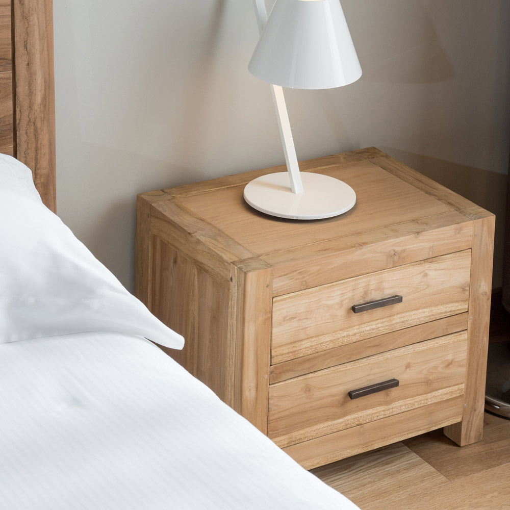 Detta sängbord i massiv teak är en kompakt och elegant möbel, perfekt för att komplettera ditt sovrum med en naturlig, tidlös stil. Hantverket och den naturliga träådringen ger möbeln ett varmt och autentiskt utseende.